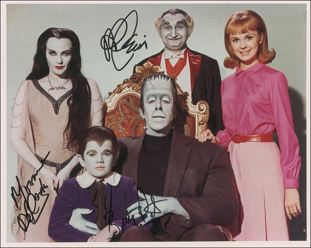 Color glossy 10 x 8 photo of the Munster family, signed in black felt tip by Yvonne de Carlo, Al Lewis, and Butch Patrick. In fine condition, with some scattered light spotting to finish. Originally obtained by in-person specialist Mike Wehrmann.