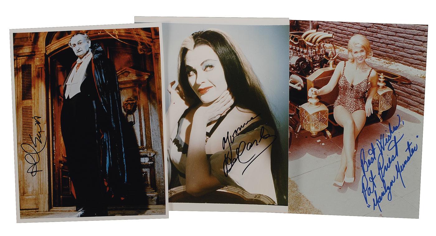 Three color glossy 8 x 10 photos of Al Lewis, Yvonne DeCarlo, and Pat Priest as their Munster family characters signed in blue or black felt tip with Priest adding a sentiment and “Marilyn Munster.” In overall fine condition.