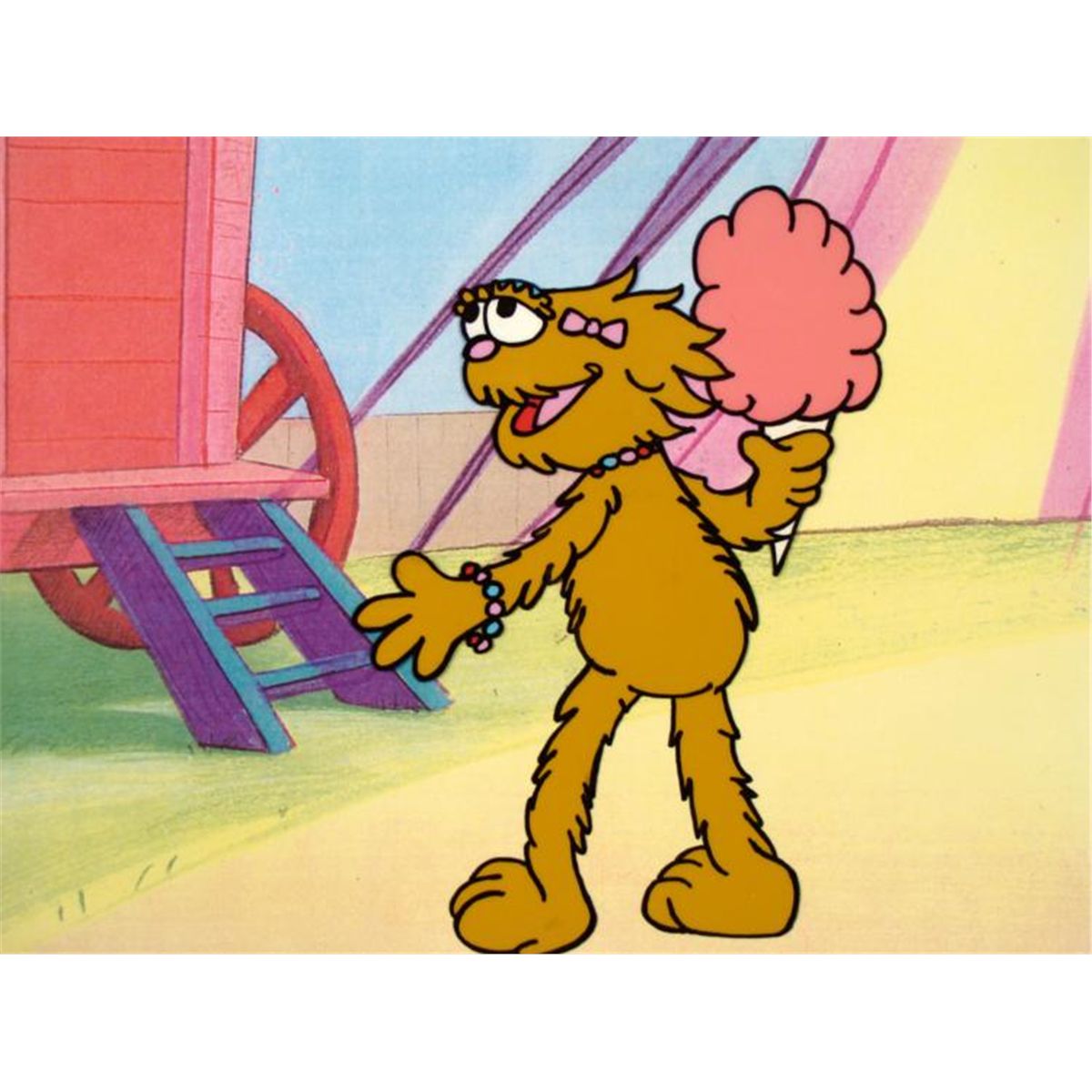 From one of the most beloved children's television show The Muppets, we present you with this wonderful sericel to bring home to the family. Here, Susie appears to be enjoying her cotton candy. * * Medium: Sericel with a printed background * Image size: 9 x 11 3/4 inchesSet-up: Double matted in white and pink, in plastic, ready to be framed Matte size: 15 x 17 inchesCondition: Excellent *