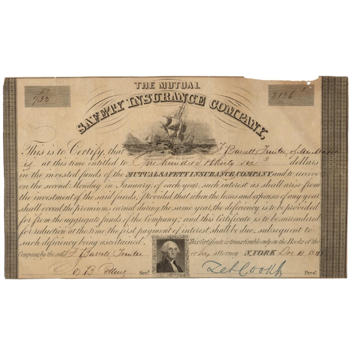 1841, New York. Investment certificate in which the owner is "entitled to $136.00 in the invested funds of the Mutual Safety Insurance Company, and to receive...such interest as sahall arise from the investment of teh said funds provided..." Engraved vignette of a sailing ship at top center, George Washington below. Some slight paper loss at top margin not affecting any printing.