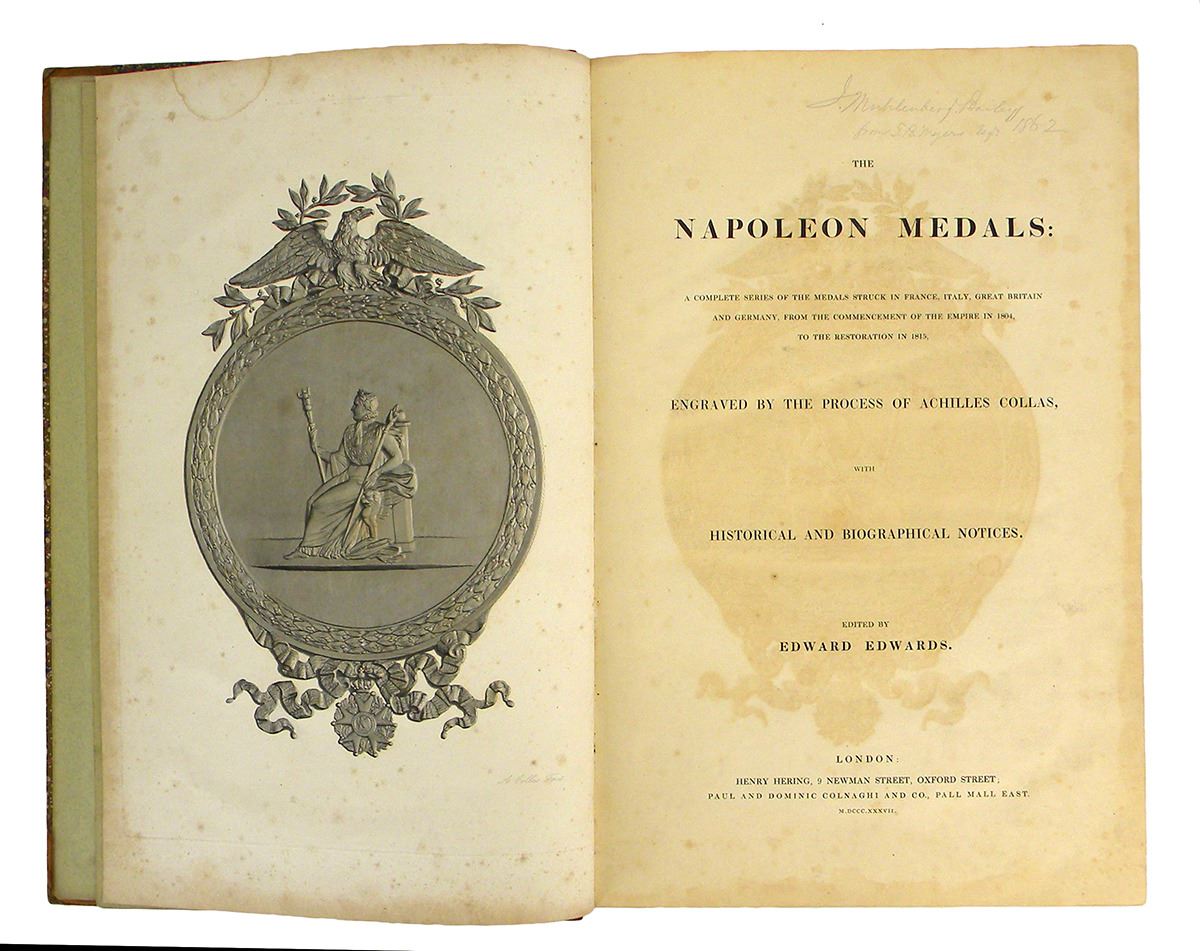 Edwards, Edward [editor]. THE NAPOLEON MEDALS: A COMPLETE SERIES OF THE MEDALS STRUCK IN FRANCE, ITALY, GREAT BRITAIN AND GERMANY, FROM THE COMMENCEMENT OF THE EMPIRE IN 1804, TO THE RESTORATION IN 1815, ENGRAVED BY THE PROCESS OF ACHILLES COLLAS, WITH HISTORICAL AND BIOGRAPHICAL NOTICES. London: Henry Hering, 1837. Folio, contemporary tan half calf with mottled sides. Frontispiece; x, 167, (1), (2) pages; 40 engraved plates. Some browning and foxing, especially to plates, as usually encountered. Lacking backstrip, with binding slightly loose. Very good or so. The first of what was intended to be a two-volume work, the second half of which never saw publication. This volume covers 1804 to 1810 and is essentially an English edition of the relevant volume of the Trésor de numismatique et de glyptique series (though it was published before the French edition). The engravings are, as with the Trésor volumes, outstanding, and used a new process perfected in France by Achille Collas. The plates were produced with a pantographic ruling machine and, in addition to being of great visual appeal, the illustrations were the most accurate ever achieved. This technical innovation, widely heralded at the time, was, within a few decades, overtaken by photographic printing processes and is relatively little known today. Very scarce (particularly with the supplement, present here, on the British Museum’s holdings) and still important. Engel & Serrure 2412. Leitzmann 37. Sigler 765.