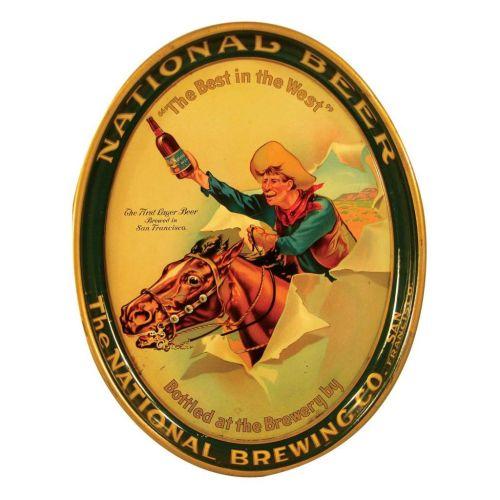 The National Brewing Co., San Francisco tin serving tray entitled, The Best of the West. Stunning Graphics and Color. The first lager beer brewed in San Francisco. Some minor scuffs around rim, otherwise excellent condition. 13 X 16 inches.
