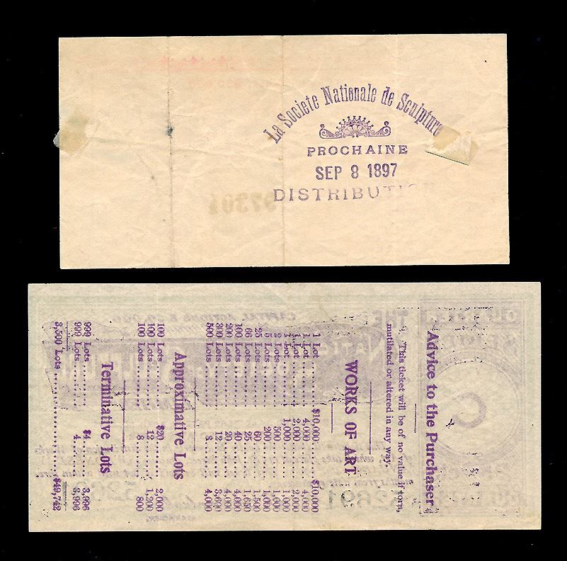 Lot of two notes "The National Society of Scupture". One is denominated at 10¢, and seems to be a time-limited discount coupon. The obverse text is English, while the reverse stamp, dated 1897, is French. Condition is VF, with stamp hinge remnants on the reverse. 67 x 129 mm, The other is denominated at 25¢ and appears to be a sort of lottery ticket with the prizes being the right to compete in the aquisition of works of art. Drawing date is Jan 24, 1900. Blue, with a light green underprinting. 71 x 147 mm. EF.