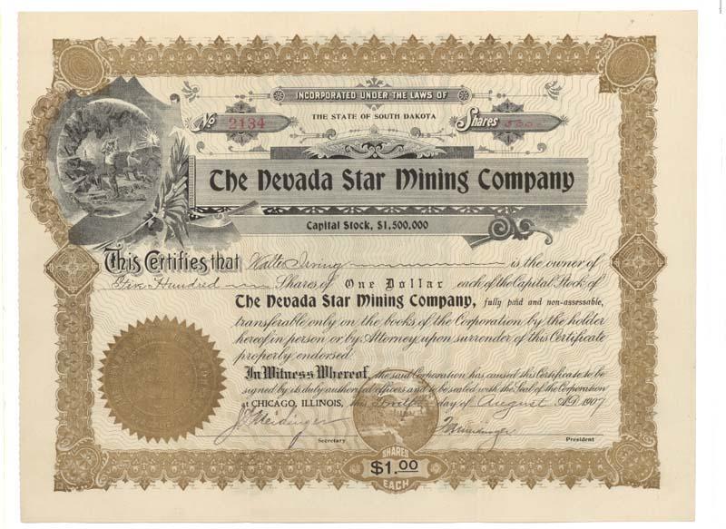 1907, South Dakota. Stock certificate for 500 shares. Gold/Black. Vignette at top left of miners at work. Uncancelled and very fine.