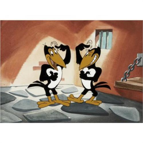 <B>"The New Adventures of Heckle and Jeckle" Heckle and Jeckle Publicity Cel (Filmation, 1979).</B></I> Paul Terry's famous blackbird duo shine in this hand-painted production cel with original background art. The art has an image area of 12" x 8.5" and is in Excellent condition. Includes a certificate of authenticity. <BR><BR><b>Shipping:</b> Framed - with Glass, Medium (<a target="_blank" href="http://www.heritageauctions.com/common/shipping.php">view shipping information</a>)