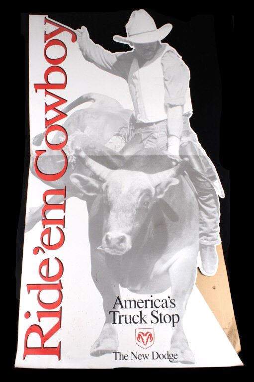Featured in this lot is this fold out cardboard advertisement for Dodge. The cardboard fold out design is large and features a bull rider and reads, “America's Truck Stop - The New Dodge - Ride 'em Cowboy”. The condition of this cardboard cutout is fair, with some wear to the edges of the cardboard; there is a moustache drawn on to the cowboy’s mouth. The measurements of this cardboard advertisement are 63 3/4" x 35 1/2".