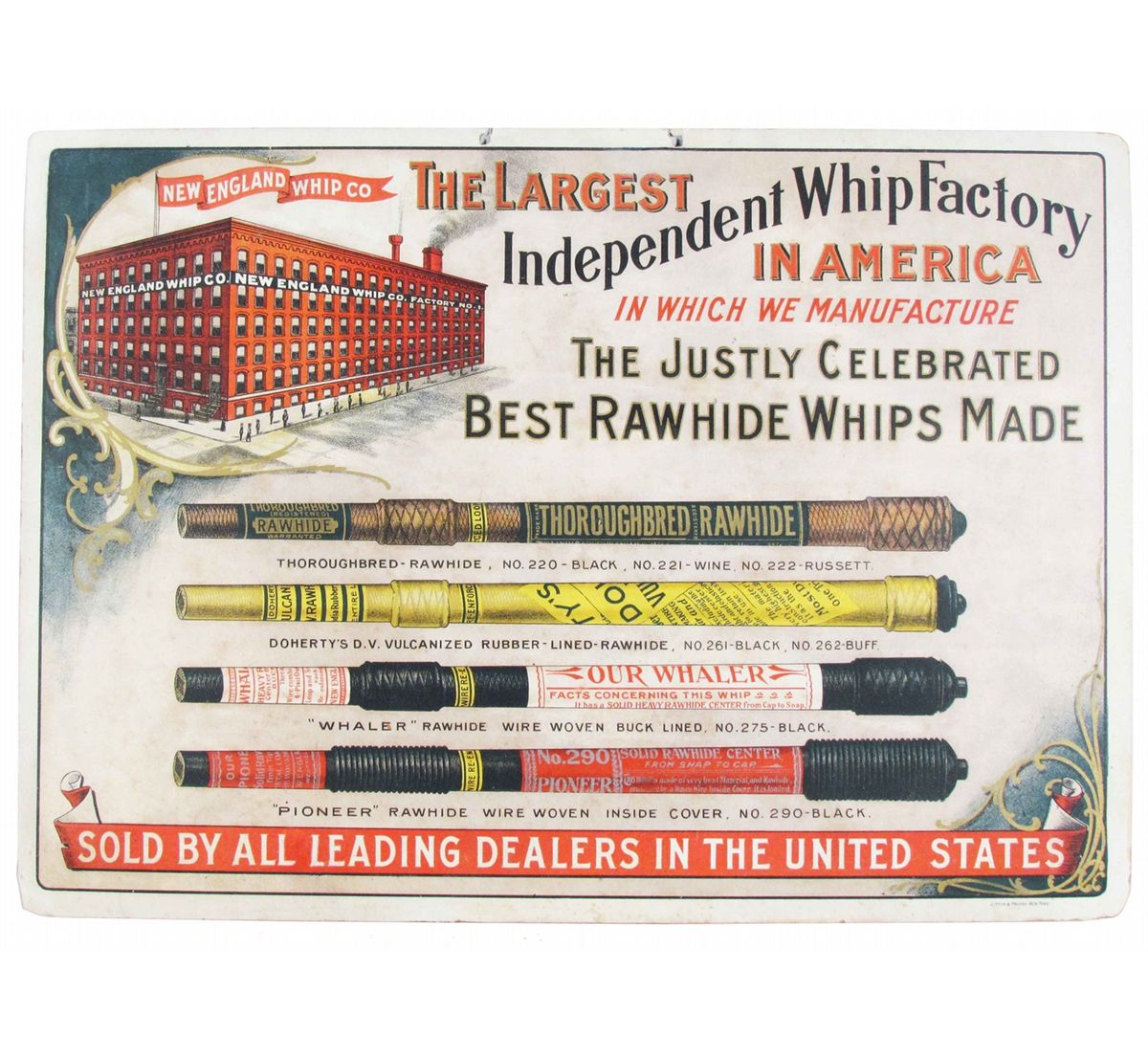 The New England Whip Co. String Hanging Sign. "Best Rawhide Whips Made". Two sided. Tears at top holes otherwise very good condition. 13 3/4 X 10 inches.