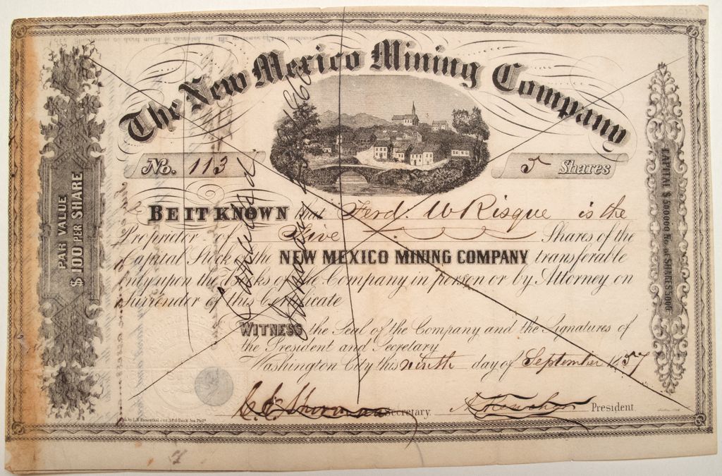Cert. # 113 for 5 shares. Issued to Fred W. Risqué