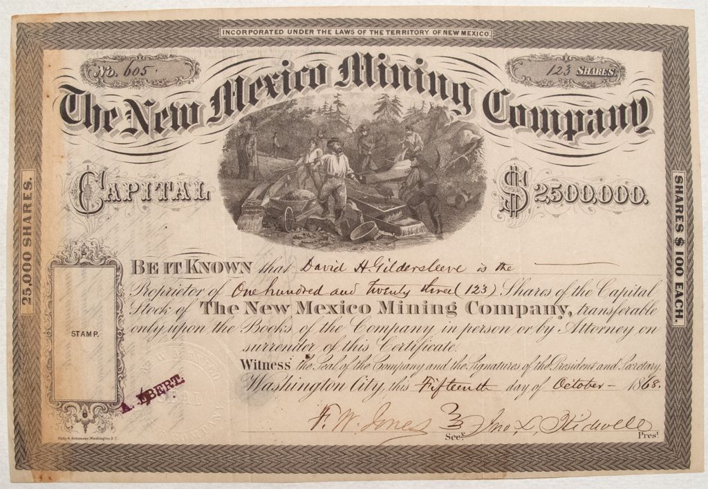 Cert. # 605 for 123 Shares issued to David H Gildersleve and signed by F W Ines & T D Kidwell