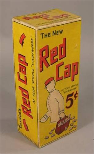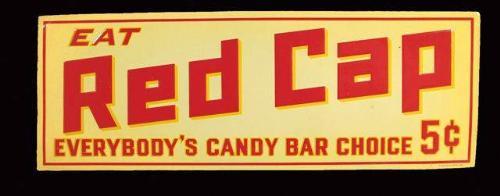The New Red Cap Embossed Tin Sign. New Old Stock. Comes with Store Candy Box. The Matthews Co. Detroit, MI. Sign is 28x10.