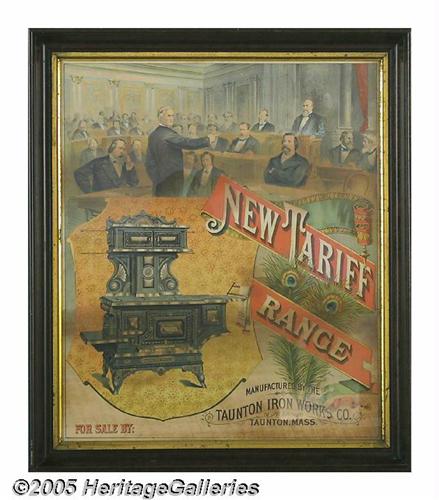 <B>The New Tariff Range Advertising Sign</B></I> Pictures an assemblage of politicians. Recognizable in the group is John Logan, a Senate member until 1886 and the runningmate for James G. Blaine in 1884. Blaine and Logan were supporters of protective tariffs, so it was a commentary of the politics of the day for the Taunton Ironworks to name their range the "New Tariff." This period 1886 paper sign is 16 1/2" by 19 3/4", complete and nicely framed. The bold graphics of the period are somewhat muted and minor browning of the paper does not detract but tends to blend in as if part of the background. It was politically correct late into the turn of the century for a politician to be used in an advertisement. It wasn't until much later that the practice was stopped, making the early pieces portraying political figures very difficult to find and quite rare. Since Taunton was the mecca for the manufacturing of iron, it is hard to find any information on this company in particular as many iron companies during that period manufactured cast stoves. This sign certainly can support the interest of a diverse collecting field. Lot:252
