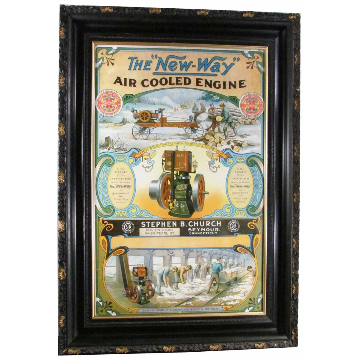 The "New Way "Air Cooled Engine Paper Sign. Beautiful color and graphics. Small paper loss top right corner, tear at top left otherwise excellent. Framed under glass. 26 1/2 X 38 inches overall.