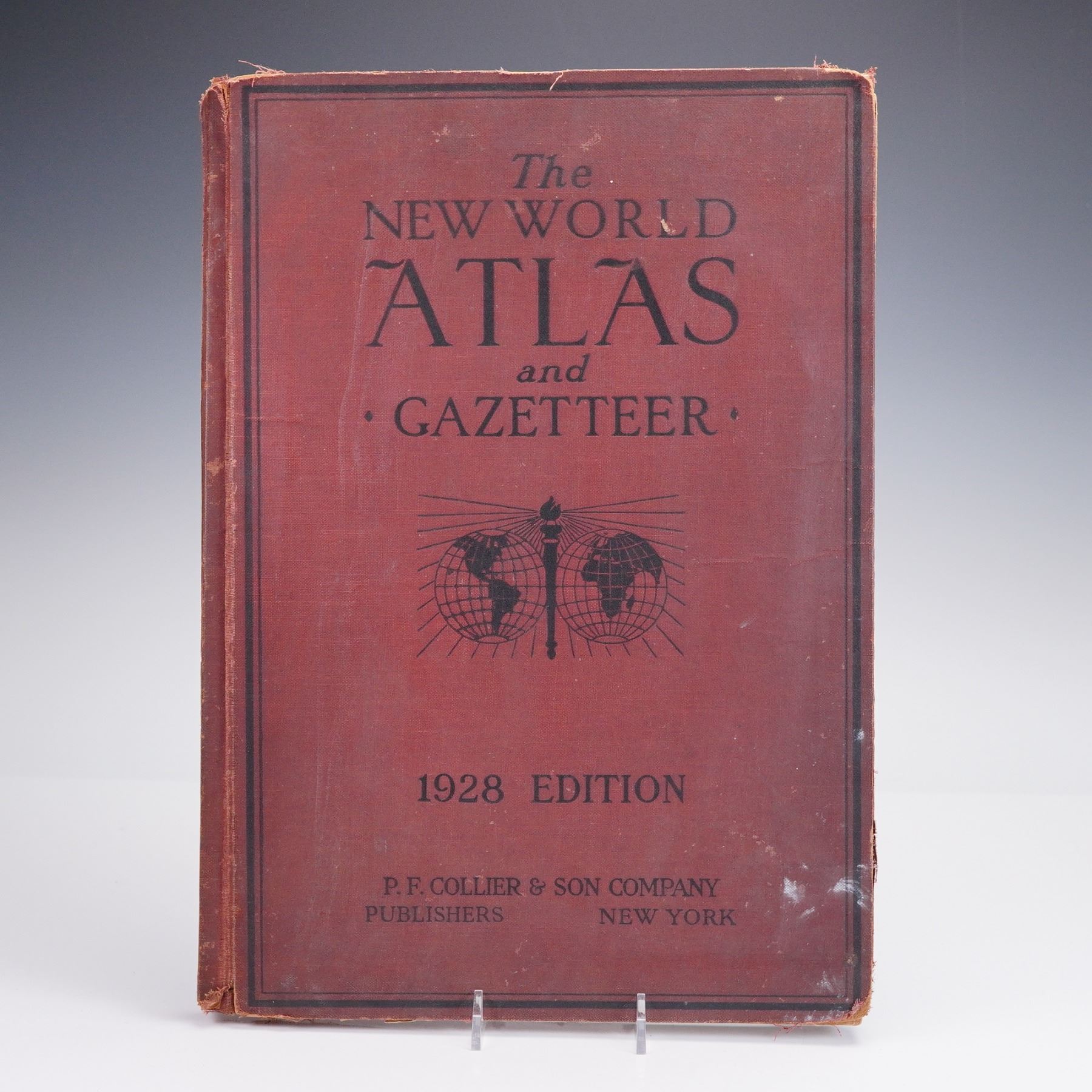 The New World Atlas and Gazetteer, 1928 Edition, published by P F Collier and Son Company, New York. Hardcover in original maroon cloth binding with black stamped title and globe motif. This richly illustrated reference includes detailed population statistics from the 1920 Federal Census, international geographic data, and full-color maps. A substantial pre-WWII American atlas offering a detailed snapshot of the global order between the wars.