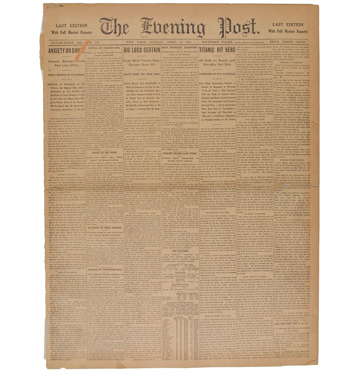 Original April 15, 1912, library edition issue of The Evening Post, New York, 17 x 22.5, 14 pages. An erroneous headline announces: “Titanic Hit Berg: All Safe on Board, and She May Not Sink.” Another predicts financial losses for the International Mercantile Marine Company: “Big Loss Certain: Even With Titanic Safe, Owners Hard Hit.” Nearly the entire front page is filled with columns describing the event—though, at the time, unaware of the tragic outcomes. In very good condition, with repaired partial edge separations to central horizontal fold, overall toning, and expected brittleness from age.