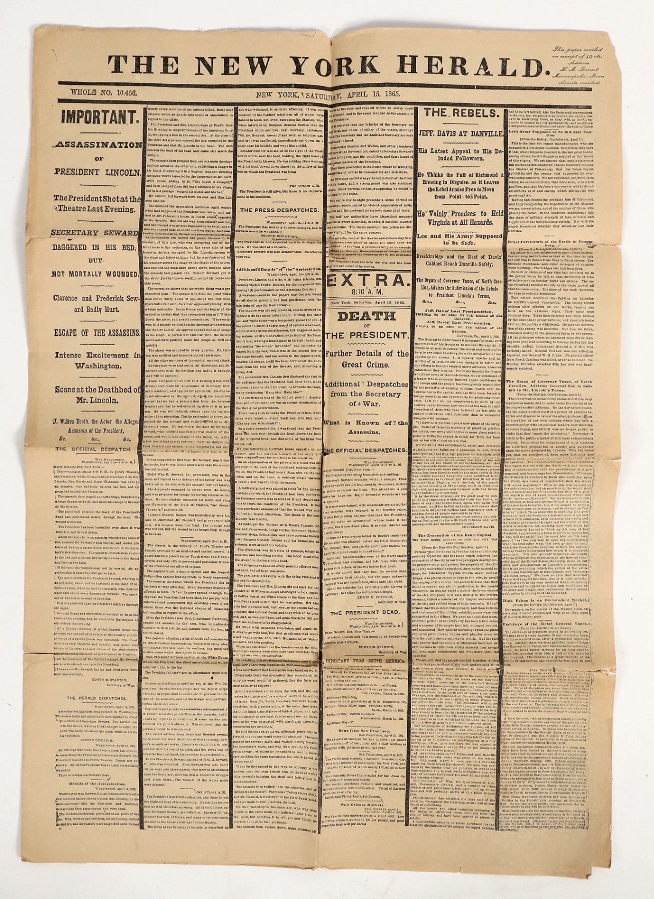 This is a 19th century reproduction of the New York Harald dated April 15, 1865. It details the assassination of President Lincoln and had gone to print hours before his actual death. It also highlights the conspiracy to end this tyranny of government by the attempts on Secretary William Seward and Vice President Andrew Johnson on the same night. Some yellowing, minor tears at the folds. Four pages of wartime coverage.