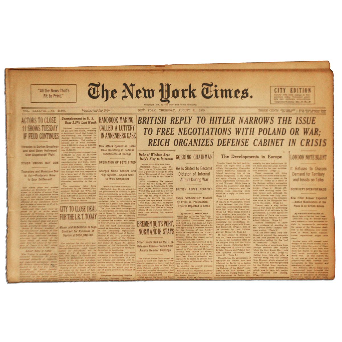 ''The New York Times'' 31 August 1939 edition, the day before Germany invaded Poland, and World War II began. Headline warns: ''British Reply to Hitler Narrows the Issue to Free Negotiations With Poland or War''. Smaller headline holds a futile hope for peace: ''Hitler Is Yielding, Washington Hears''. Germany's Luftwaffe bombed Poland just hours after this newspaper was printed. Expected toning to paper running 20pp. and measuring 16.75'' x 22.25''. Chipping to left edge from previous binding. Overall very good plus.