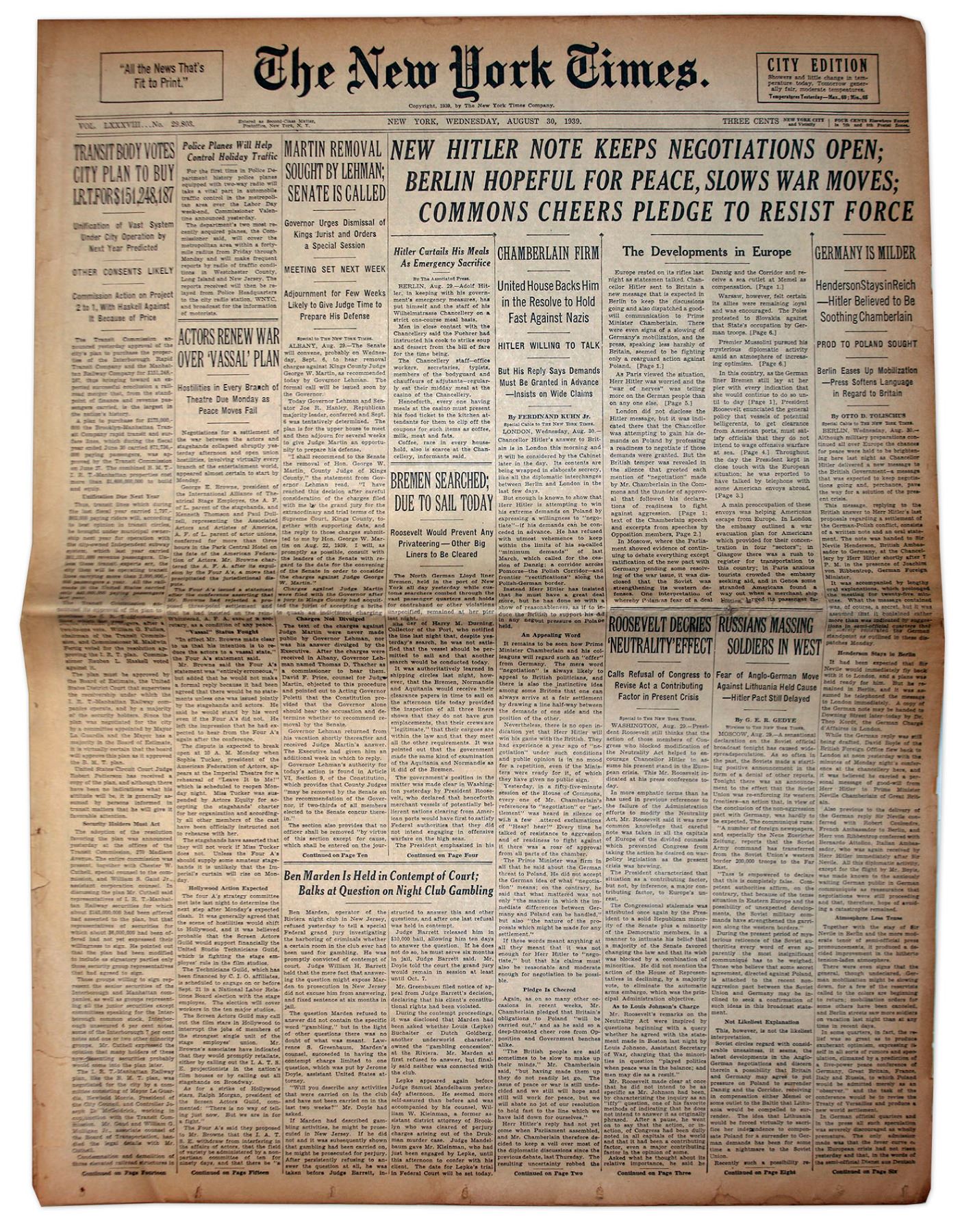 30 August 1939 edition of the ''The New York Times'' just two days before Germany invaded Poland and World War II began. Headline reads ''New Hitler Note Keeps Negotiations Open'' as the Nazi leader was secretly planning to invade Poland. Other front page articles report ''Roosevelt Decries 'Neutrality' Effect'' and ''Hitler Curtails His Meals'' as Hitler strikes soup and dessert off his staff's menu. Expected toning to paper running 18pp. and measuring 16.75'' x 22.25''. Chipping to left edge from previous binding. Overall very good plus.