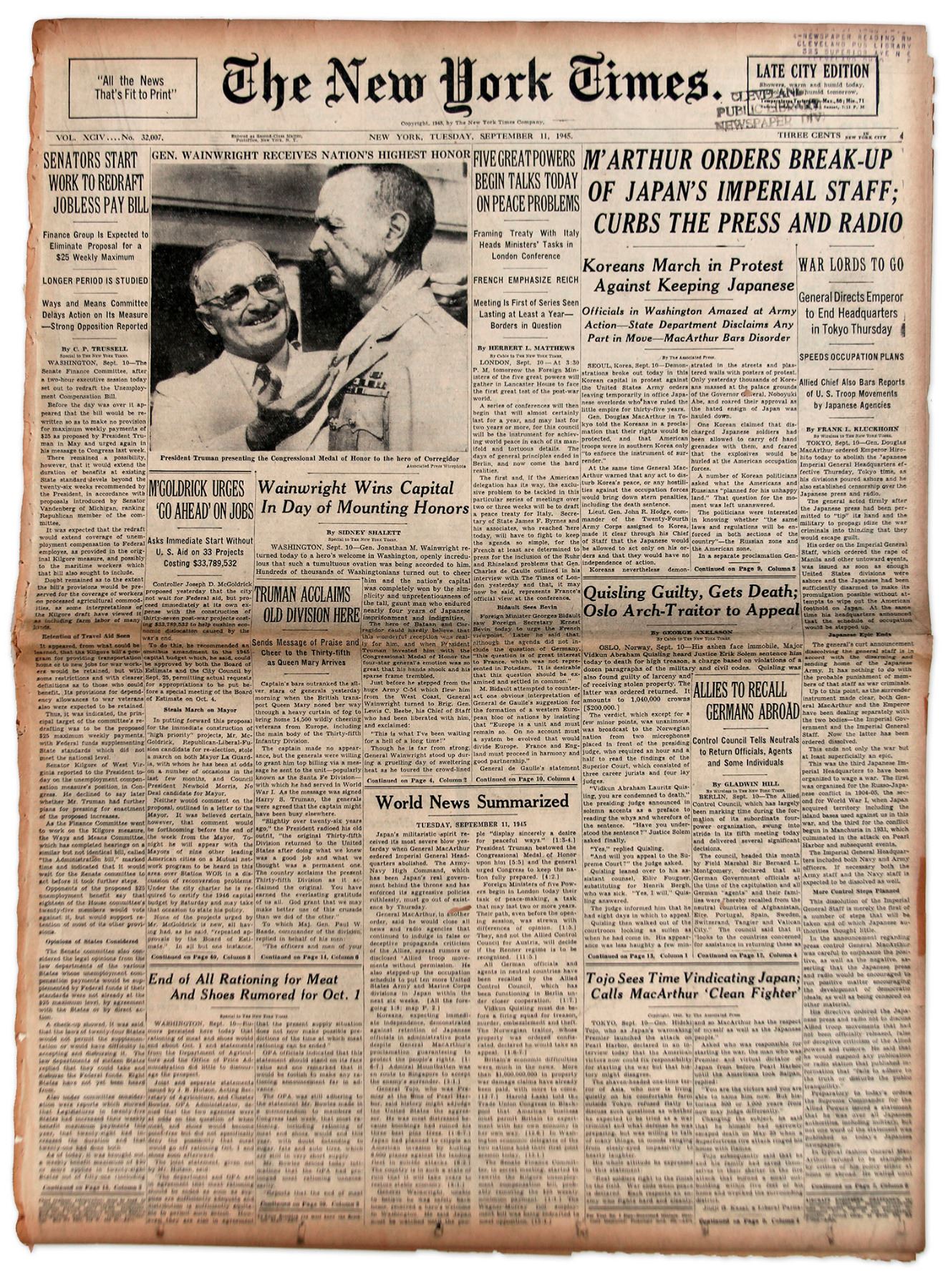 ''The New York Times'' from 11 September 1945. In the wake of WWII, an article quotes Japanese General Hideki Tojo as calling MacArthur a ''clean fighter.'' The photo on the front page shows President Truman presenting POW General Jonathan M. Wainwright the Congressional Medal of Honor for his service at Bataan and Corregidor. Another article claims the end is in sight for the rationing of meat and shoes. A new unemployment insurance bill is developed in the Senate as a result of job loss after the war. Runs 40pp. Toning, chipping to left edge and Cleveland Public Library stamps to upper right. Very good.