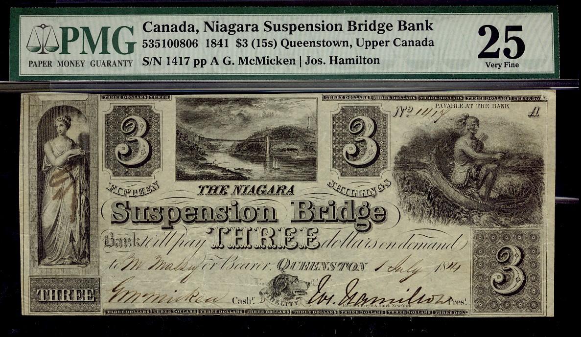 The Niagara Suspension Bridge Bank 1841 $3 (15s) #1417 CH-535-10-08-06 PMG VF25