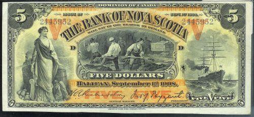 The "Nicest" we have ever seen! The Bank of Nova Scotia, $5 1908 "Orange V's" typed, No. 2445952. CH-550-28-12a. The note is very attractive with bright and vibrant colours. Looks uncirculated but technically is a choice EF-AU example. Candidate fo