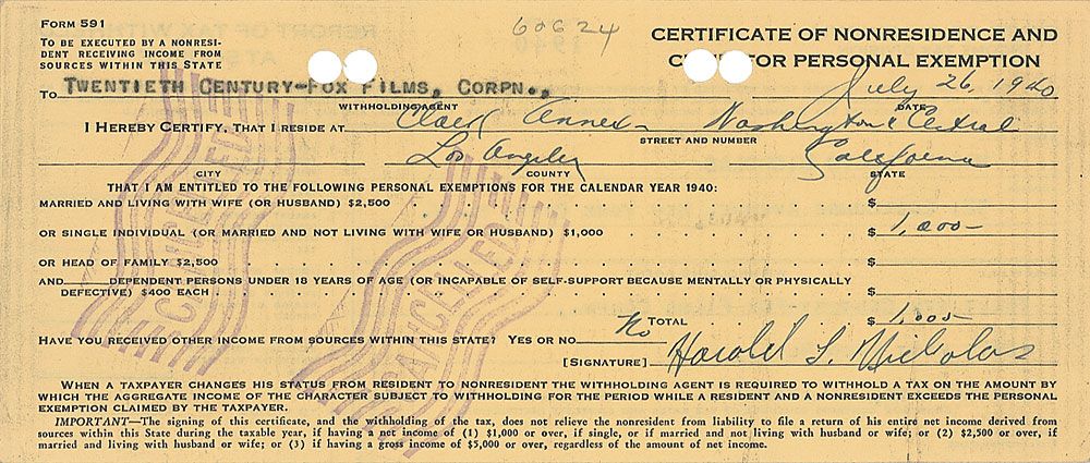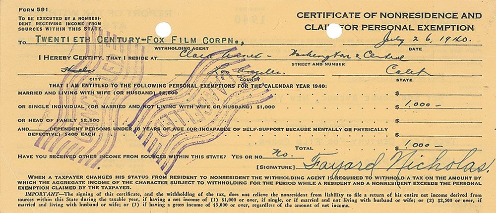 Two State of California income tax forms, each one page both sides, 8 x 3.5, July 26, 1940, one signed “Fayard Nicholas” and the other “Harold J. Nicholas.” In overall fine condition, with expected document wear. Accompanied by three fantastic unsigned vintage matte-finish 11 x 14 photos of the brothers.