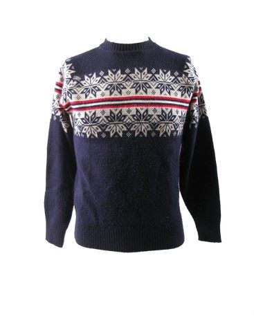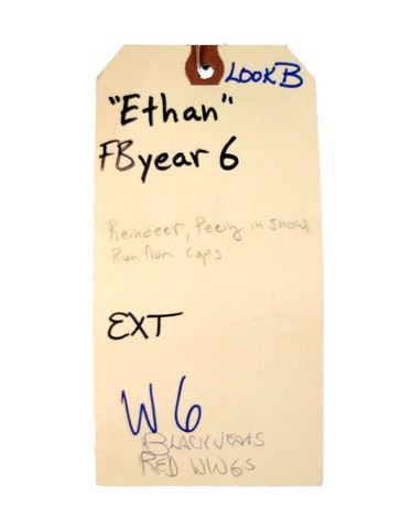 Ethan (Joseph Gordon-Levitt) screen worn, hero, charcoal grey with black leather sleeves baseball style 'Gap' jacket, navy with horizontal white snowflake design sweater, and fluorescent orange with navy pom pom and New York on the front hat. Includes wardrobe tag.