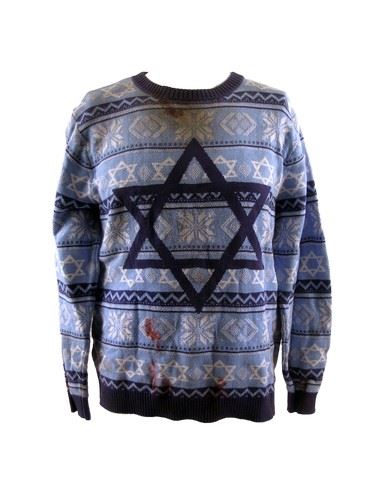 Isaac (Seth Rogen) distressed at the neck, light blue with navy and white Star of David design long sleeve 'KBL' holiday sweater.