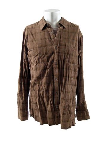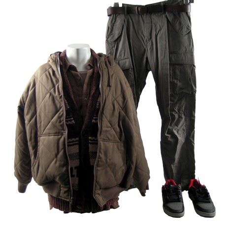 Isaac (Seth Rogen) screen worn, hero, olive green quilted zip up the front with hood and black fleece lining 'Northwest' jacket, (size XL) brown, cream, and black chunky knit with shawl collar 'Gap' cardigan sweater, (size XL) olive with black and brown window pane micro corduroy long sleeve 'Natural Blue' shirt, (size XL) light brown short sleeve crew neck 'American Apparel' t-shirt, (size L) brown leather 'Natalie's Kit' belt, (size 40) army green cargo 'H&M' pants, (size 38) and black and grey lace up the front low top with black laces 'Etnies' shoes. (size 11.5) Includes wardrobe tag.