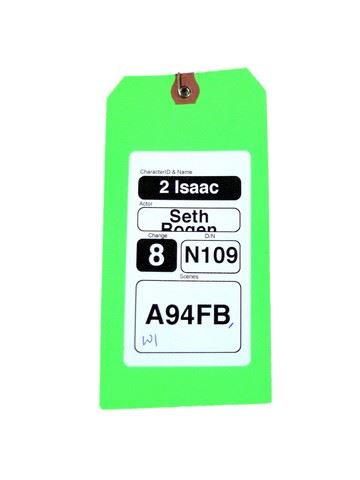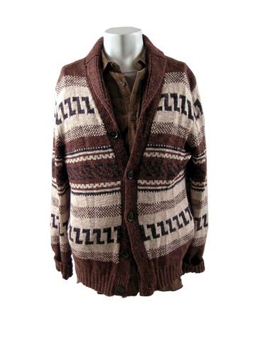 Isaac (Seth Rogen) screen worn, hero, olive green quilted zip up the front with hood and black fleece lining 'Northwest' jacket, (size XL) brown, cream, and black chunky knit with shawl collar 'Gap' cardigan sweater, (size XL) olive with black and brown window pane micro corduroy long sleeve 'Natural Blue' shirt, (size XL) light brown short sleeve crew neck 'American Apparel' t-shirt, (size L) brown leather 'Natalie's Kit' belt, (size 40) army green cargo 'H&M' pants, (size 38) and black and grey lace up the front low top with black laces 'Etnies' shoes. (size 11.5) Includes wardrobe tag.