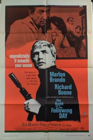 The Night of the Following Day (Universal Pictures, 1969). One Sheet. Starring: Marlon Brando, Richard Boone and Rita Moreno. There are fold lines, creases, marks and stamps. Very Fine. (27" X 41").