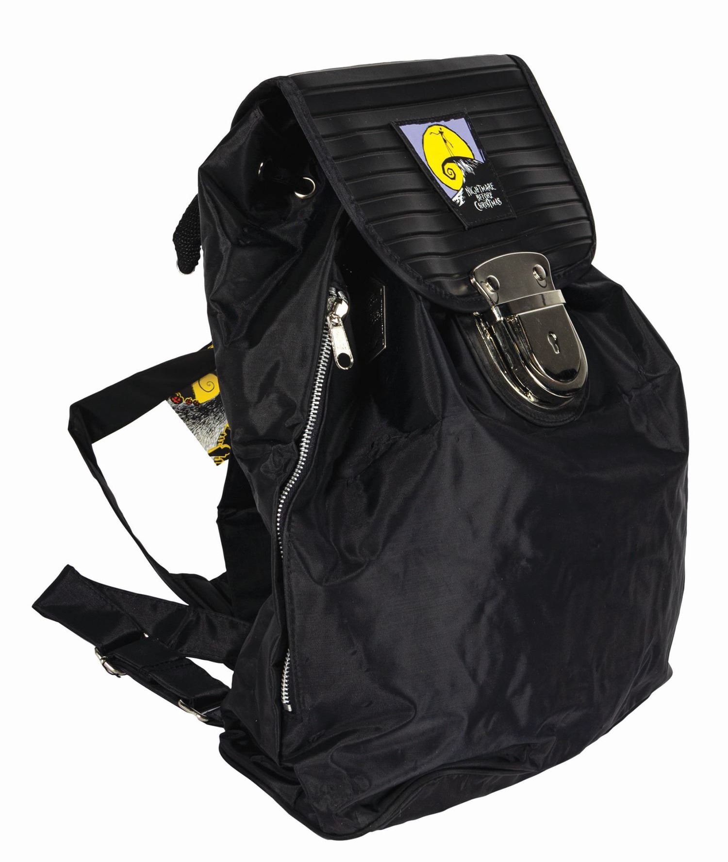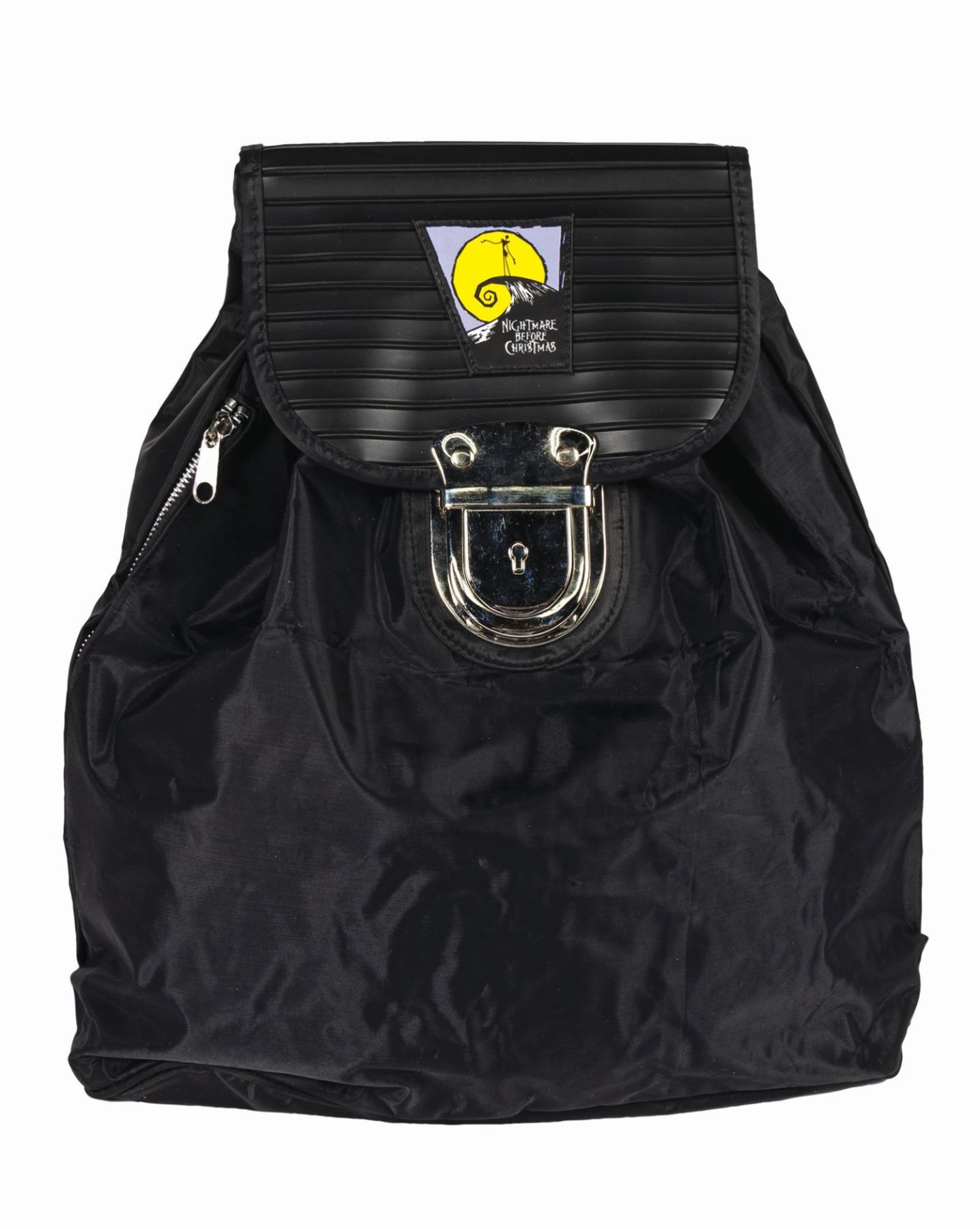 (Disney, 1993) A nylon backpack released in the original publicity blitz for The Nightmare Before Christmas. The drawstring-cinching satchel features a rubberized top flap with a patch depicting Jack Skellington on the spiral hill and fastens to the front of the bag with a push button tab and eye closure. Ornamented by a removable stamped metal tombstone-shaped charm. The backpack also retains a paper special offer tag and a $1 rebate on the film's CD soundtrack. Measuring 17"x16" empty, the backpack is in very fine as-new condition.