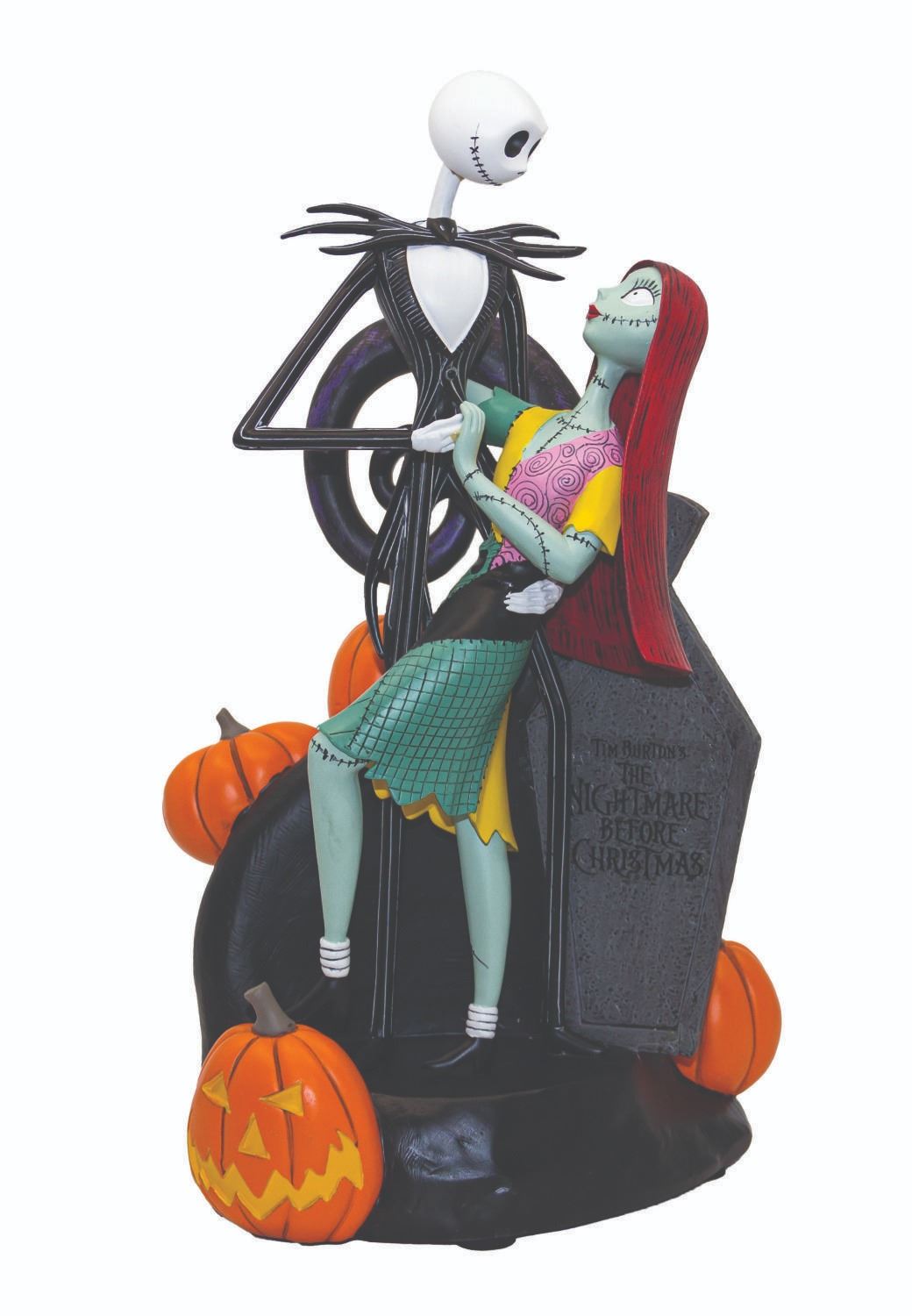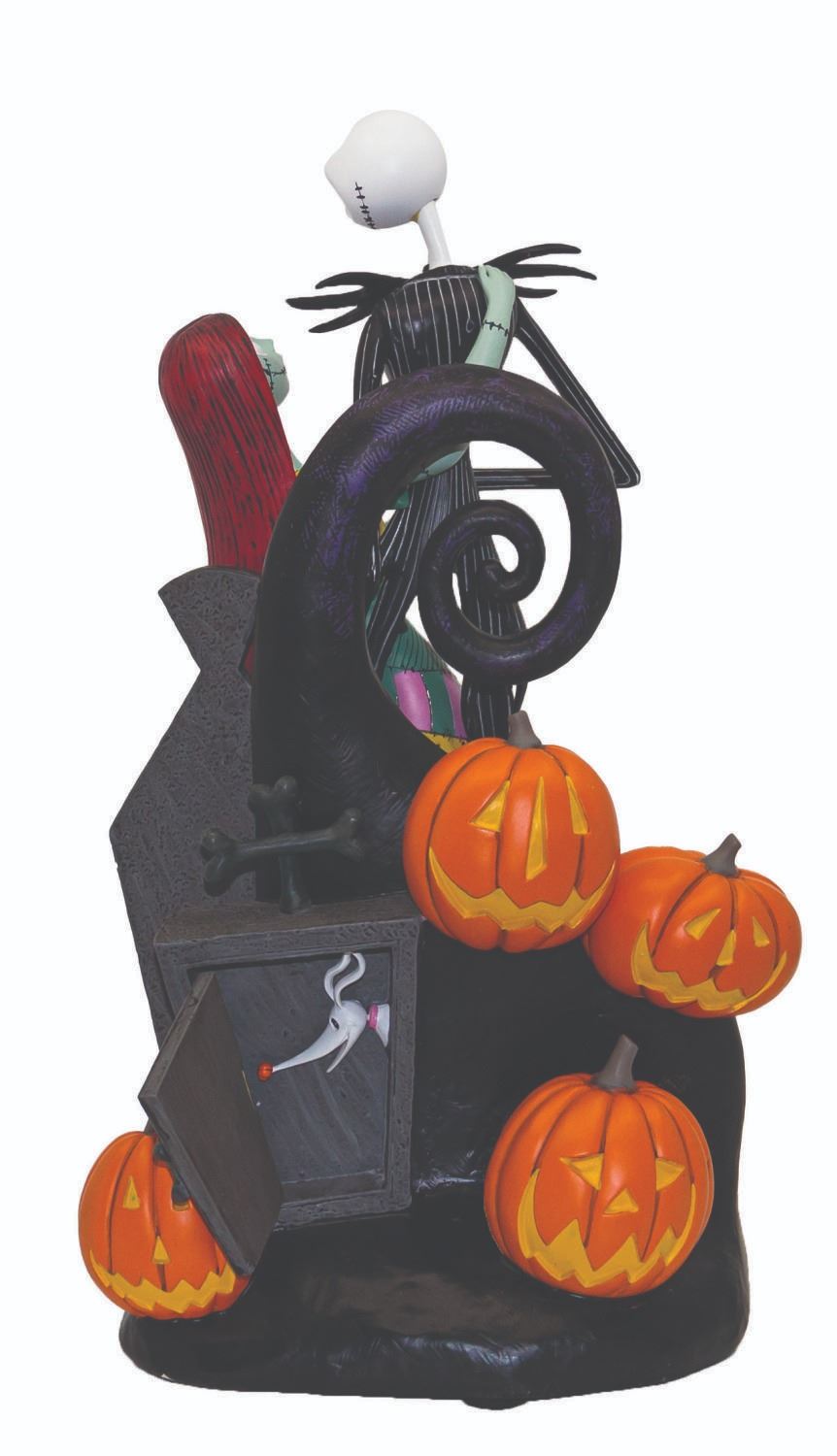(Disney, c.2000s) A large resin figure featuring Jack Skellington and Sally from The Nightmare Before Christmas by artist Keri Murphy, created exclusively for Disney Parks. The fully sculpted hand-painted figure features the iconic spiral hill from the film, battery-powered Jack-o'-Lantern lighting elements, and a crypt door on the reverse which opens to reveal Zero the dog. The bottom of the base is printed with the film's title and Keri Murphy's signature. The original box is included. Measuring 19.5"x10" and 10.5" in deep, the figure is in fine condition with only faint surface wear and pigment transference from the hand-applied paint.