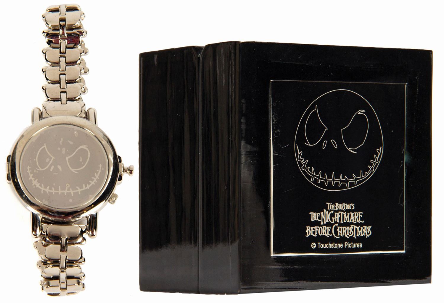 (Disneyland, c.2006) A limited edition The Nightmare Before Christmas wristwatch. The original segmented silver metal band consists of links in the shape of vertebrae, combining to create a spinal column. The back of the case is engraved with edition number 079/300. Presented in its original 3.25"x4"x4" black lacquered wood display box. Also includes original Certificate of Verification. The watch case measures approximately 2" in diameter and the band measures 9" fully extended. Both present in fine condition, with the case still covered by its original plastic cling protection.