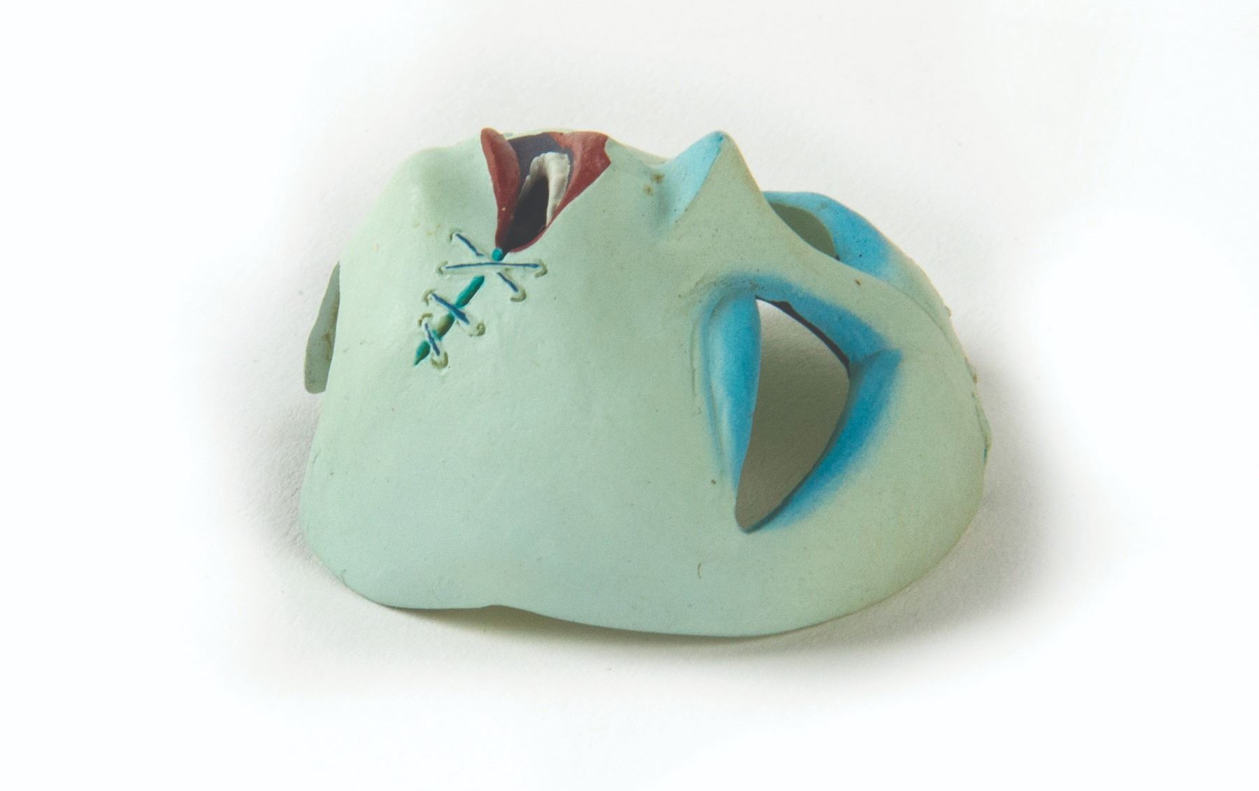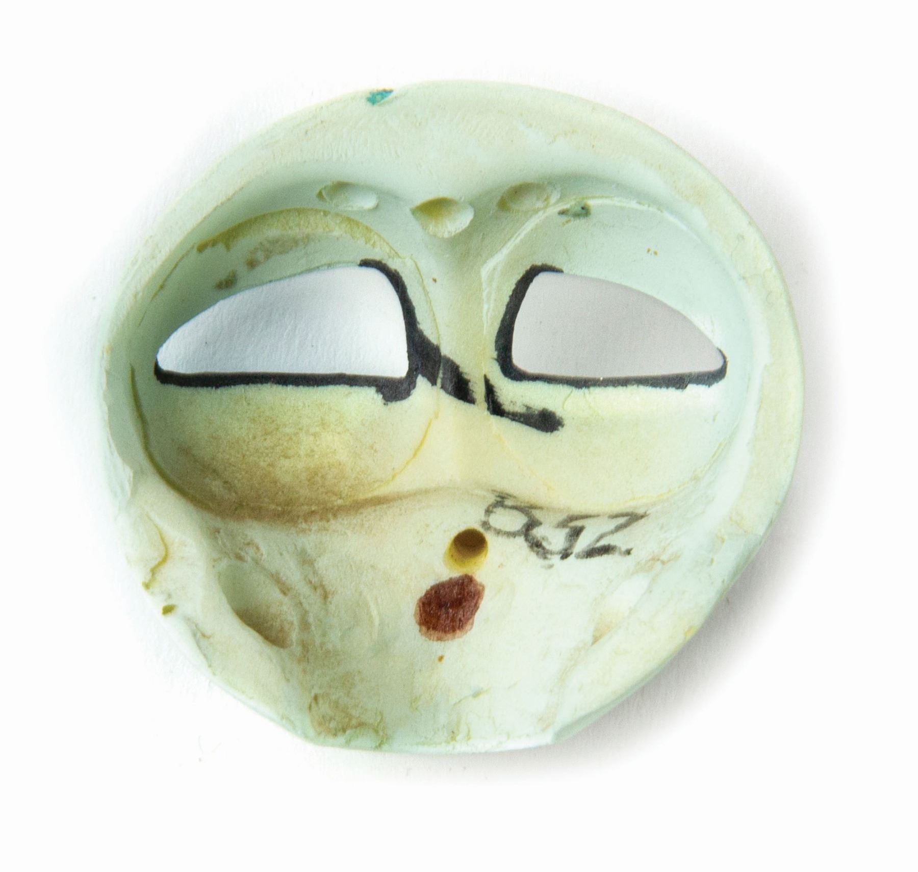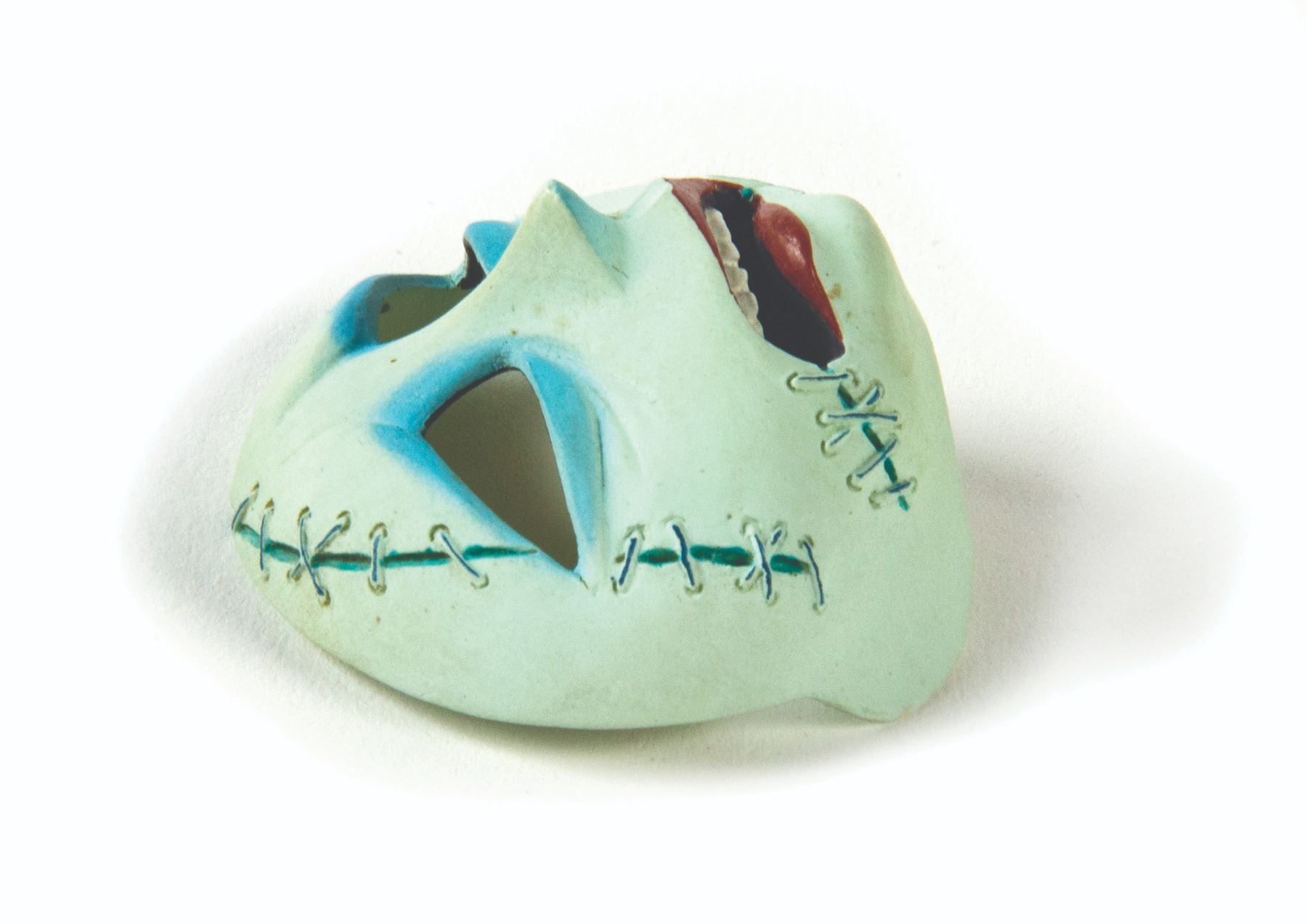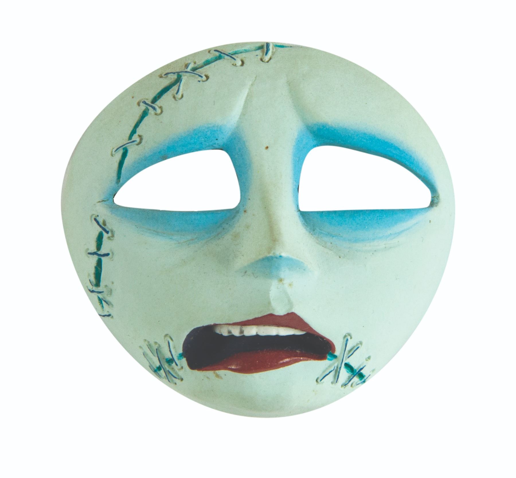 (Touchstone, 1993) An original stop motion character face for Sally from Tim Burton's The Nightmare Before Christmas. As part of the stop motion process, the facial movement for the characters was achieved through the incredible process of replacing the faces themselves with different sets of hand-painted resin faces. This particular face is coded inside as "B52" for use during production. Measuring approximately 1.75" in diameter, the stop motion Sally face is in very fine condition.