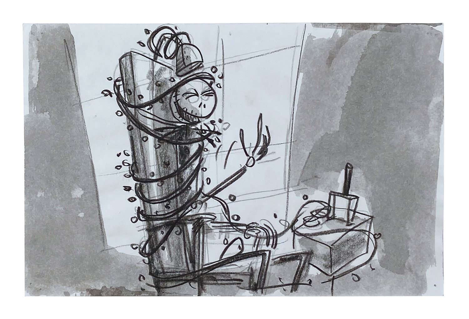 (Disney, 1993) An original storyboard drawing used in the creation of The Nightmare Before Christmas. Accomplished in pencil and ink wash on thin art paper, the storyboard depicts Jack Skellington sitting in an electric chair decorated with Christmas lights. The piece measures 5.5"x8.5" and is in very good condition. It exhibits corner pinholes and minor production handling.