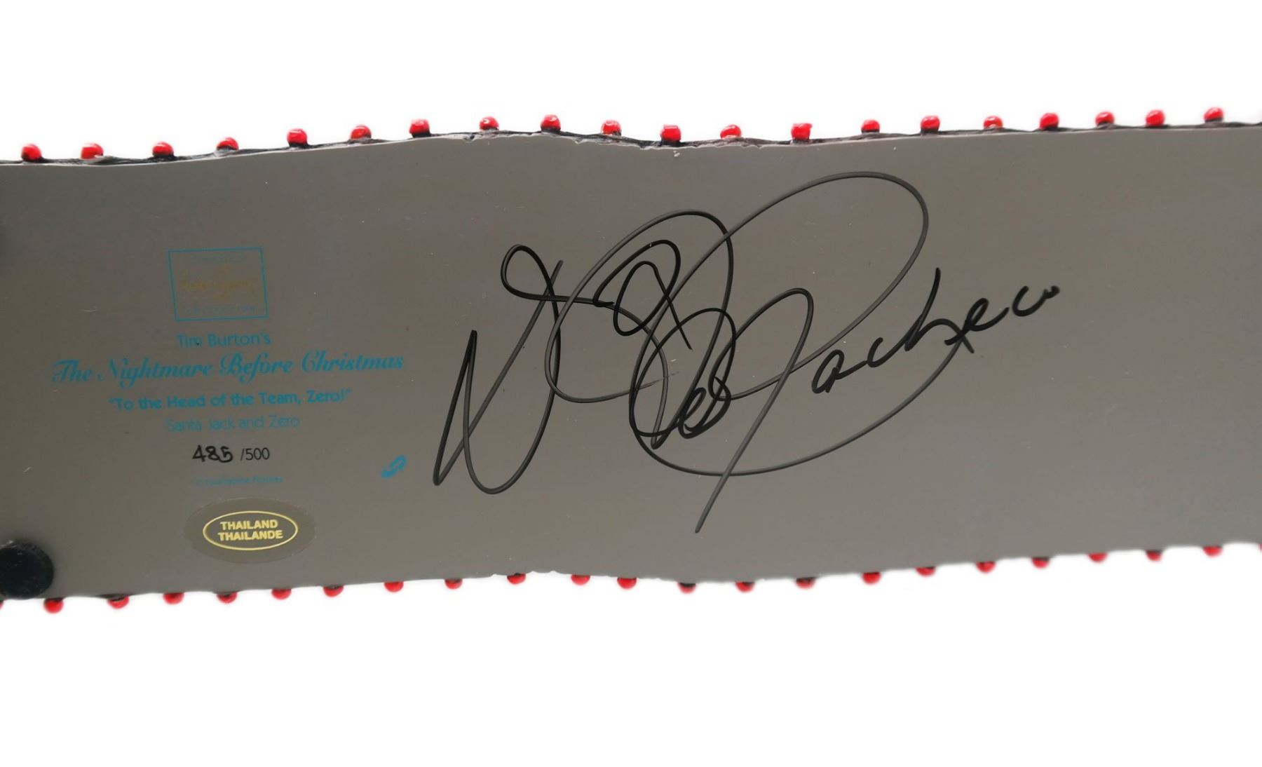 (WDCC, 2005) A limited edition figure depicting Jack Skellington, Zero, and the skeletal reindeer from The Nightmare Before Christmas. Titled "To the Head of the Team, Zero!", this rare figure is number 485/500 and is signed on the base by artist Dave Pacheco. Measuring approximately 7.5"x19" and 3.25" deep, the figure is in very good condition and appears to have two repaired antlers. The original box and Certificate of Authenticity are included.
