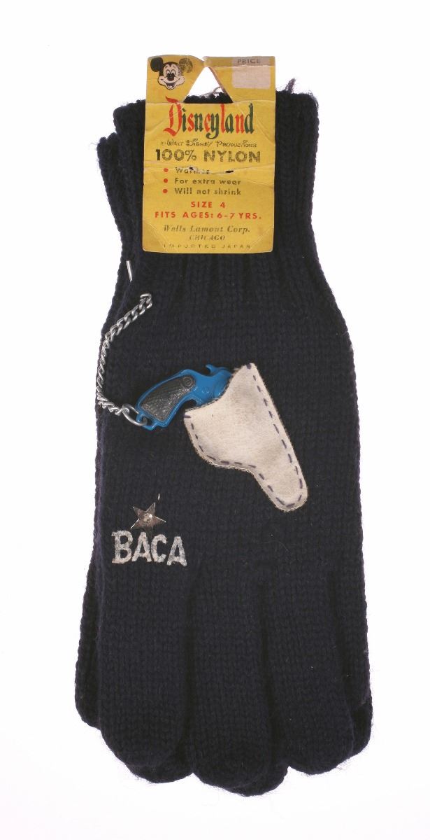 (Disneyland, 1958) Pair of child's gloves featuring a silver star with the name "Baca" below it for the title character of Disney's television program, "The Nine Lives of Elfego Baca". The gloves also feature a toy gun charm that is attached to the gloves, and a small holster sewn into the gloves for the gun. A charming pair, unused, and still retaining their Disneyland tag. Measures 7"x2.75". In good condition, and missing a piece of the gun charm.