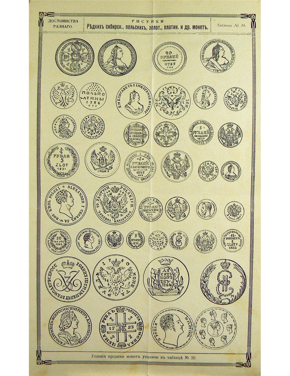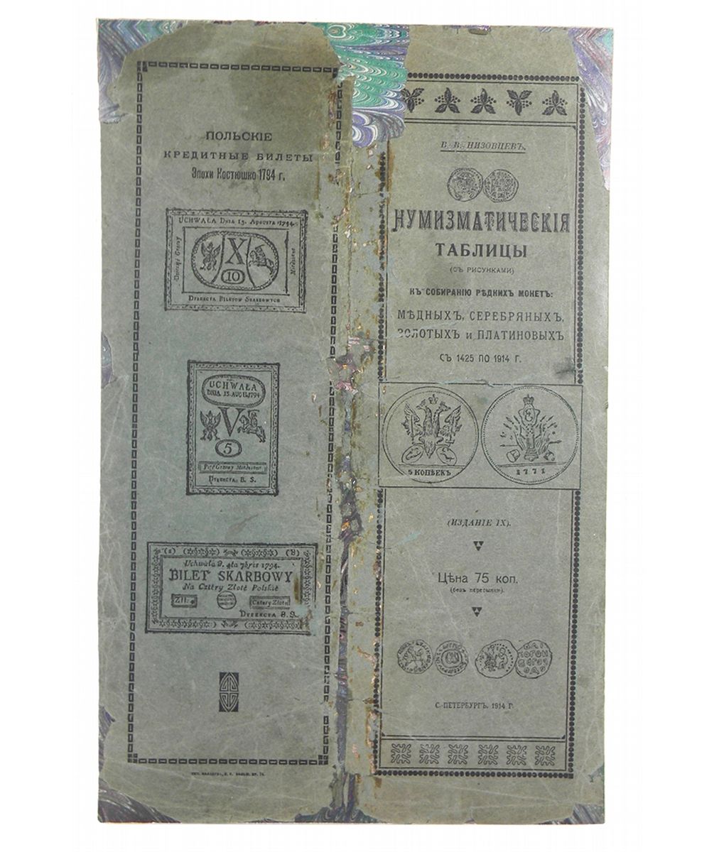 Nizovtsev, V.V.НУМИЗМАТИЧЕСКIЯ ТАБЛИЦЫ (СЪ РИСУНКАМИ) КЪ СОБИРАНIЮ РѢДКИХЪ МОНЕТЪ: МѢДКЫХЪ, СЕРЕБРЯНЫХЪ, ЗОЛОТЫХЪ И ПЛАТИНОВЫХЪ СЪ 1425 ПО 1914 Г. St. Petersburg, 1914. Ninth edition. 35 by 11.5 cm as folded, original printed card covers. 20 tables printed in various colors, folded as issued. Housed in modern blue cloth folder. Covers chipped and backed with marbled paper. Tables very good. An unusual production. Quite rare.