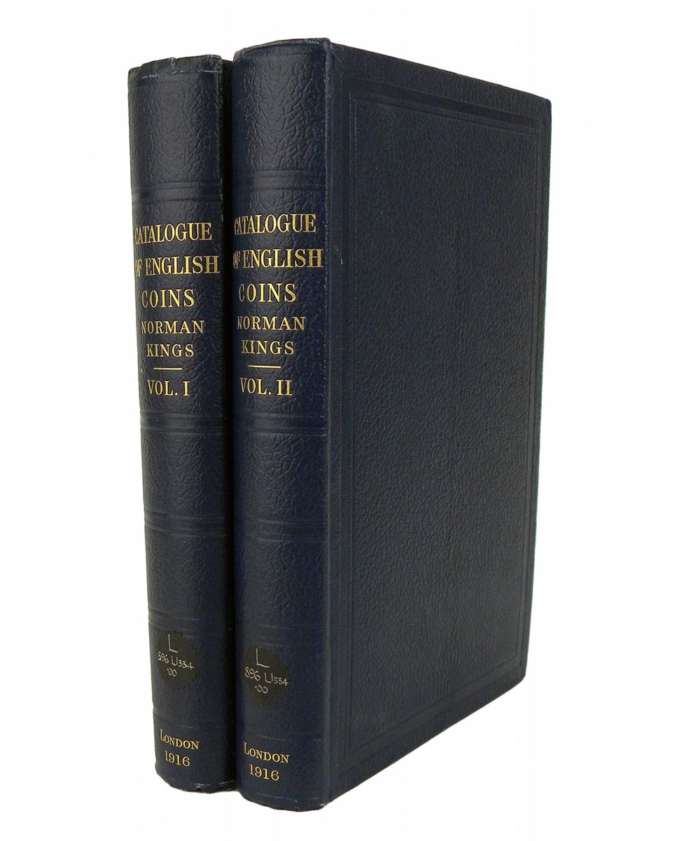 Brooke, George Cyril. A CATALOGUE OF ENGLISH COINS IN THE BRITISH MUSEUM: THE NORMAN KINGS. London, 1916. Two volumes. 8vo, original matching blue textured cloth, gilt. cclv, (1); (6), 462 pages; tables; folding epigraphic tables; 62 fine collotype plates of coins. Library stamps and labels; very good. Still a standard work. Clain-Stefanelli 6110*. Grierson 178.