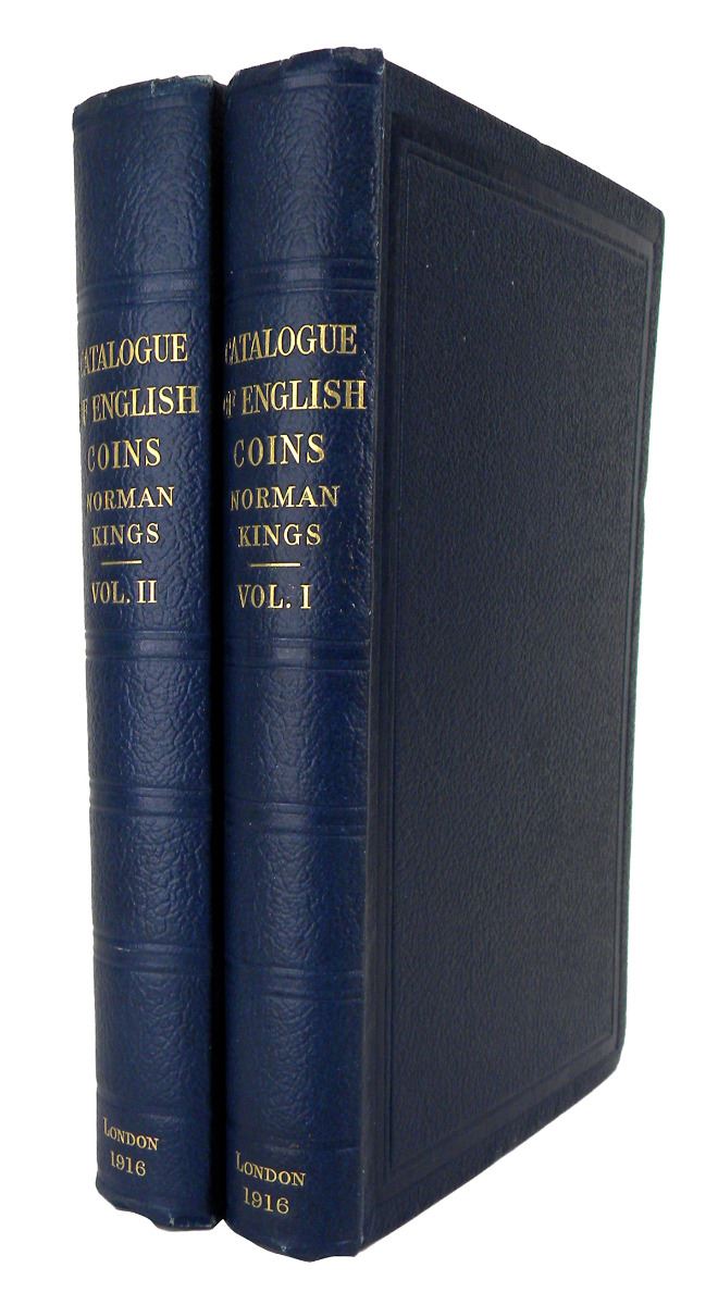 Brooke, George Cyril. A CATALOGUE OF ENGLISH COINS IN THE BRITISH MUSEUM: THE NORMAN KINGS. London, 1916. Two volumes. 8vo, original matching blue textured cloth, gilt. cclv, (1); (6), 462 pages; tables; folding epigraphic tables; 62 fine collotype plates of coins. Fine. An exceptionally well-preserved set of this still-standard work. Clain-Stefanelli 6110*. Grierson 178. Ex Joel L. Malter, with his bookplate. From the library of Tom Cederlind.