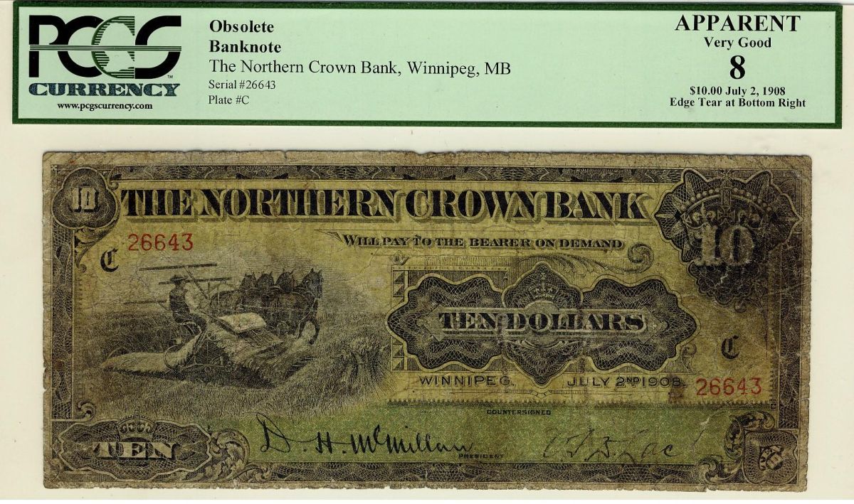 The Northern Crown Bank, 1908 $10 #26643, CH-545-10-06, PCGS VG8. Only 8 examples known. Very rare.