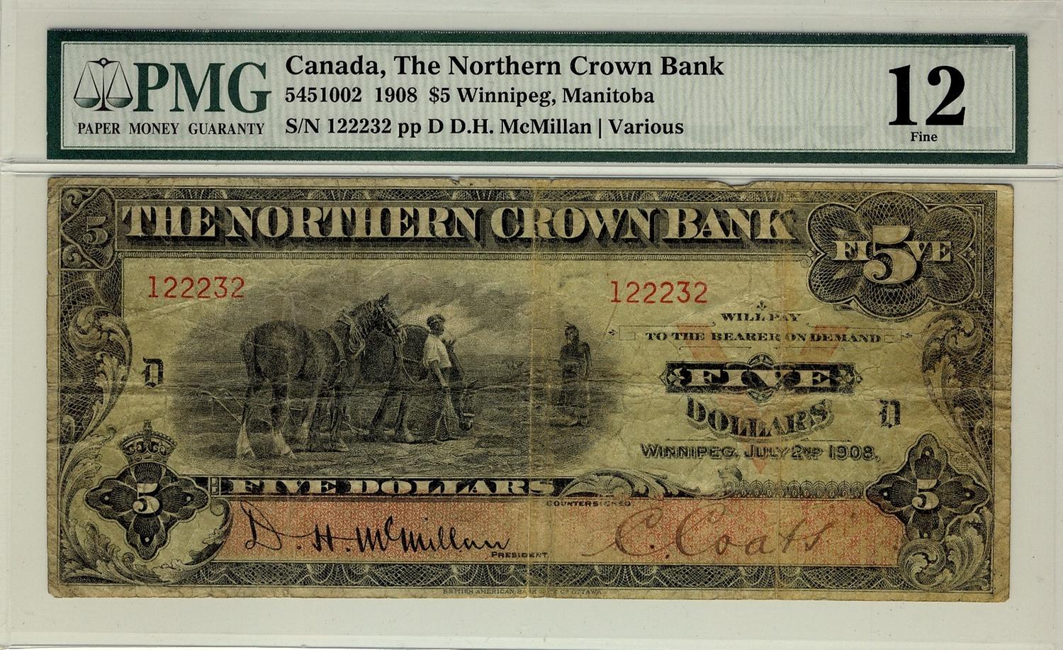 The Northern Crown Bank, 1908 $5 #122232, CH-545-10-02, PMG F12. Less than 14 known.