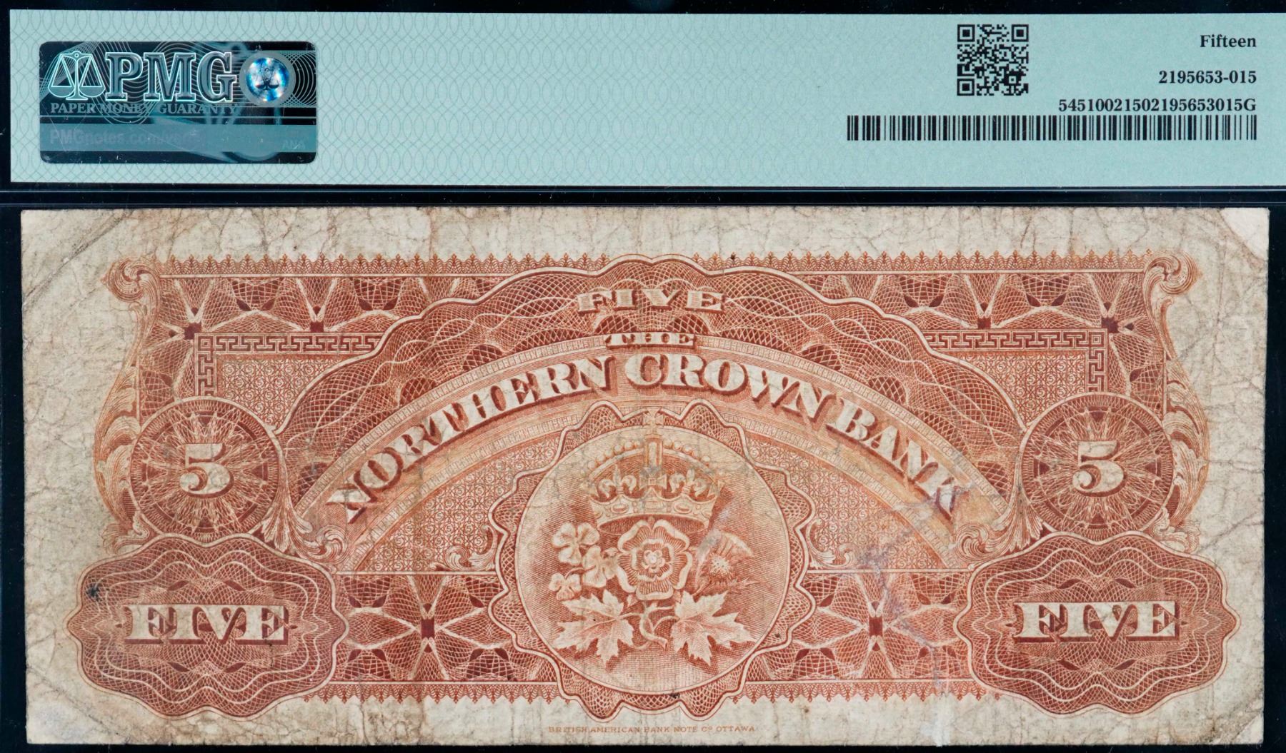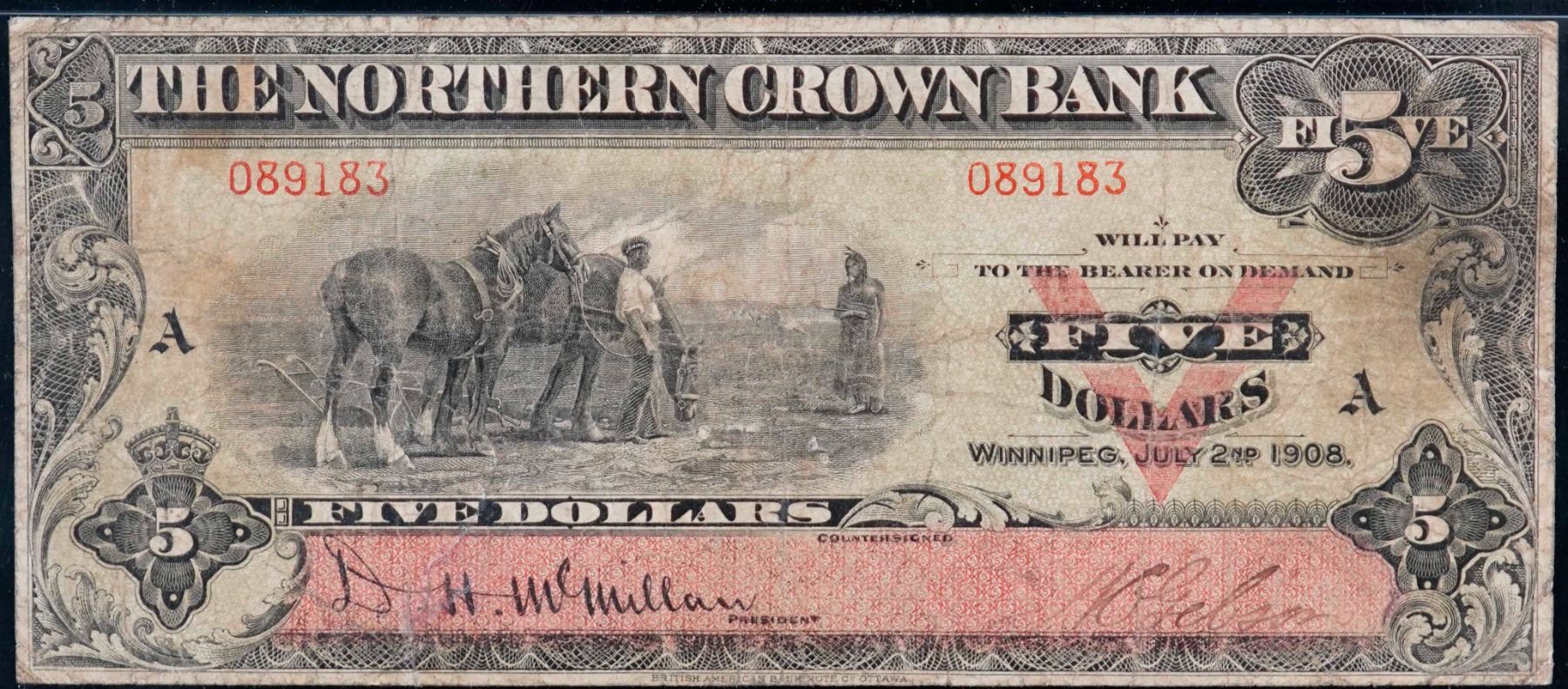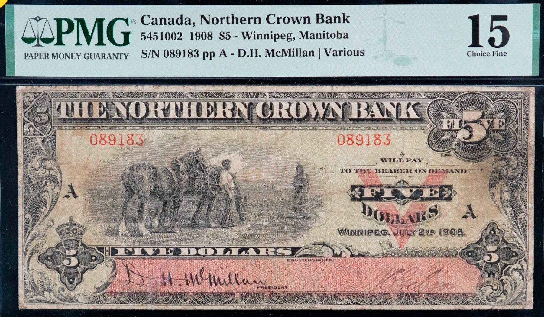 The Northern Crown Bank - Winnipeg 5 Dollars July 2nd, 1908 CH# 545-10-02 #089183, PMG Choice Fine-15 Canadian Paper Money Society Note Registry 2022 of known surviving notes is 18 (1 held in institutions)