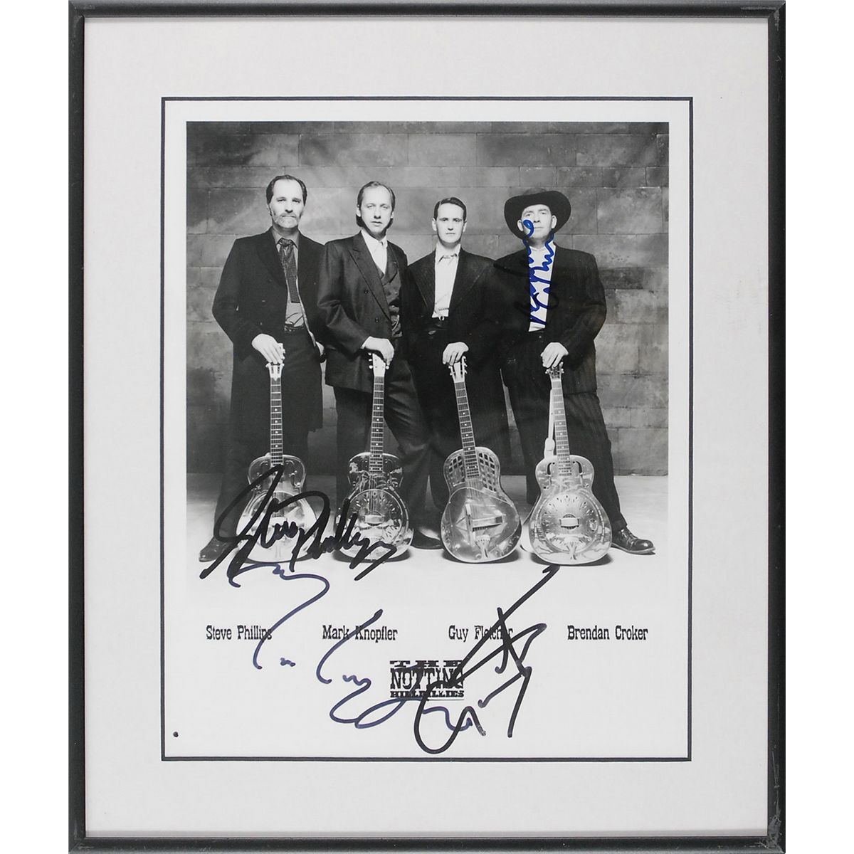 Glossy 7.75 x 9.75 publicity photo of The Notting Hillbillies, signed in black felt tip by Steve Phillips, Mark Knopfler, and Guy Fletcher. Matted and framed to an overall size of 10.5 x 12.5. In fine condition.