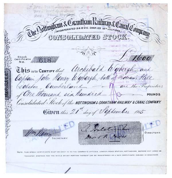 1915, England. Consolidated Stock. Stock certificate for 1,600 Pounds. Black. Litho. Small archival tape repair to a tear in upper right corner. Scarce. Lightly stamp cancelled.