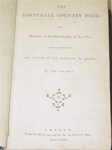 The Novelists Magazine Vol. VII. London: Printed for Harrison and Co., 1782. 8vo - over 7¾" - 9¾" tall. Hard Cover. Ex-Library. Good Condition. Illustrated throughout, text in 2 column format, in a library binding. Containing ***The Fortunate Country Maid or Memoirs of the Marchioness of L_ V_ translated from the French of the Chevalier De Mouhy - 2 Volumes, 290pp. ***Memoirs of a Magdalen; or The History of Louisa Mildmay by Hugh Kelly, in 2 volumes, 85pp. ***Letters Between Theodosius and Constantia by Dr. Langhorne, in 2 Volumes, 69pp. ***The Adventures of Ferdinand Count Fathom by Dr. Smollett, in 2 Volumes, 220pp. Covers worn, some page edge chips/tears.