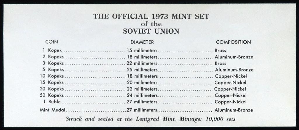 The Official 1973 Mint Set of the Soviet Union. Struck and Sealed at the Leningrad Mint. Mintage: 10,000 Sets.