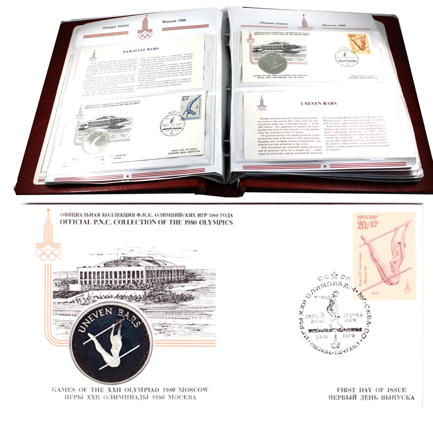 1980 Moscow Olympics 20x Silver Medallic First Day Cover Set Royal Canadian Mint and Russia Collaboration release. The Official 1980 USSR Moscow Philatelic Numismatic Collection Medallic First Day Cover Set. Limited Edition set of only 20,000 Released. Each First Day cover includes and Silver Sport Themed coin, Official USSR Stamp featuring the Themed sport with Cancellation.  Comes in original Red Binder with Slip cover and C.O.A.