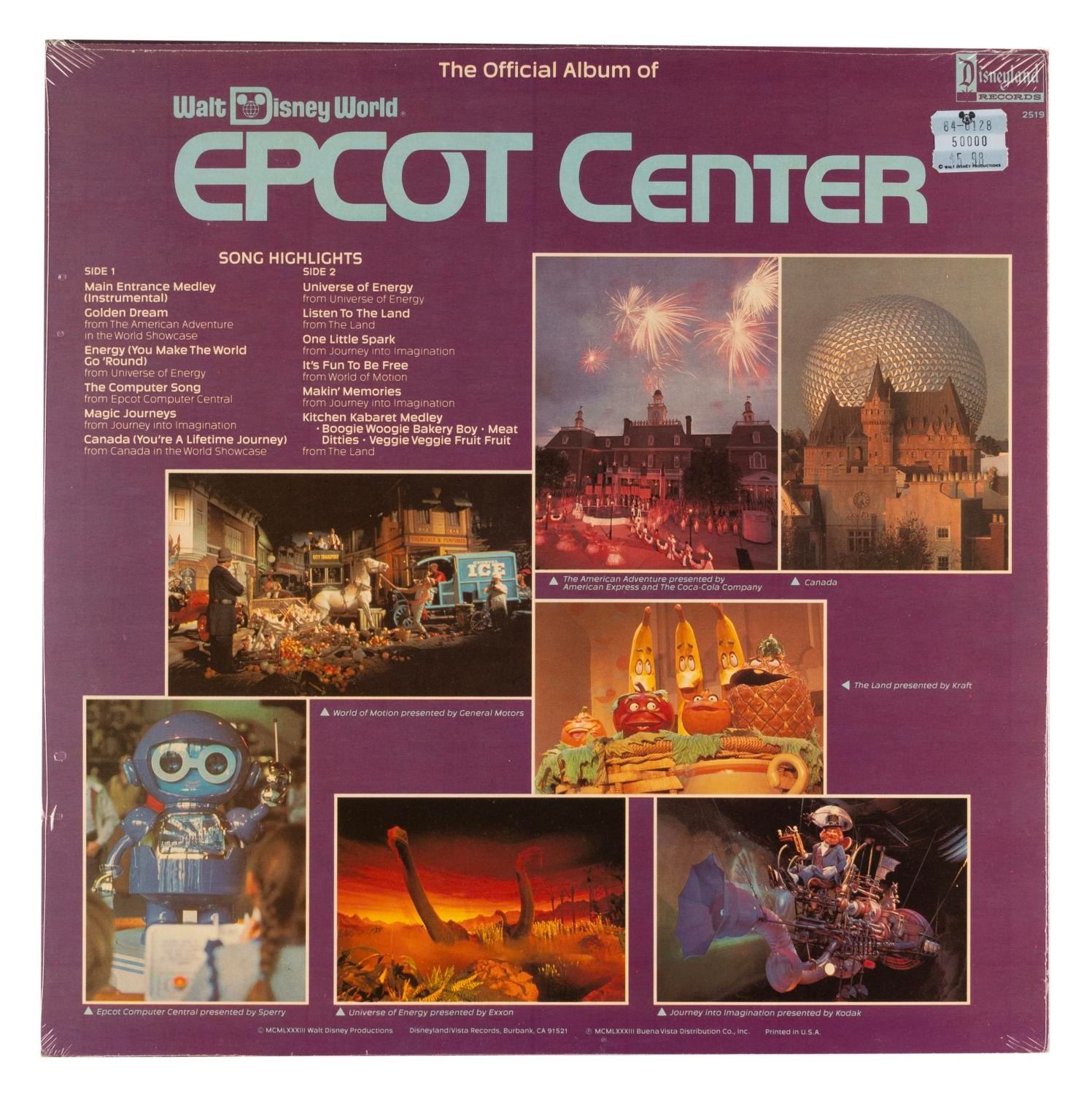 (Disneyland Records, 1983) The Official Album of EPCOT Center 12” vinyl record promoting the newly opened Park. Measuring 12.5" x 12.5", the record is in fine condition in the original shrink-wrap.