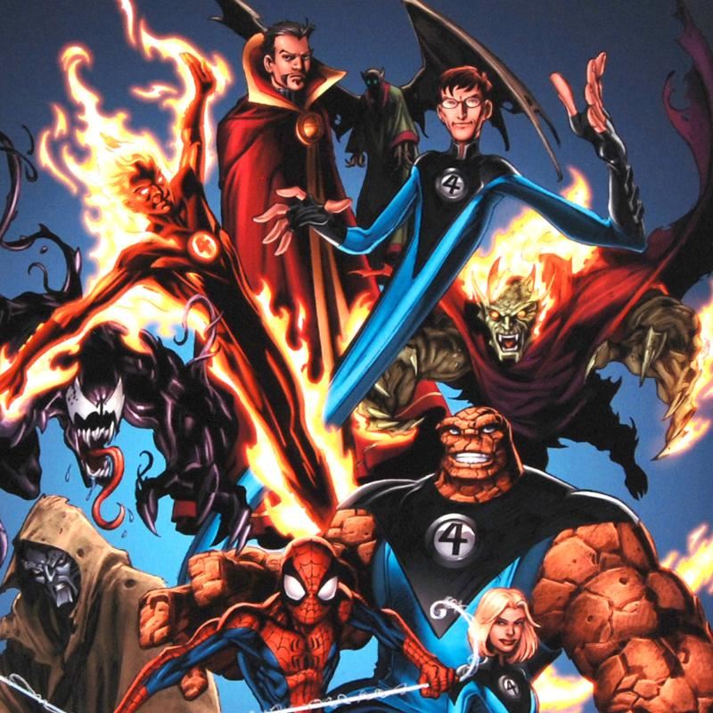 A piece of comic book history, this limited edition print, drawn by Mark Bagley, depicts The Fantastic Four, Spider-Man, and Villains from the Marvel Universe. Mark Bagley got his start by winning Marvel's Try-Out contest, for which he was awarded penciling jobs. Soon, Bagley was drawing regularly for the renowned Spider-Man franchise. "The Official Handbook of the Marvel Universe: Ultimate Marvel Universe" is a limited edition giclee on canvas by Mark Bagley presented by Marvel Comics, and numbered. This piece comes gallery wrapped and ready to hang. Includes Certificate of Authenticity! Measures approx. 18" x 27" (image); approx. 1.5" (depth).